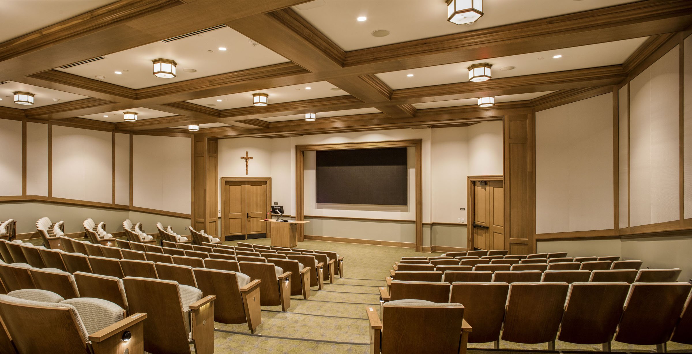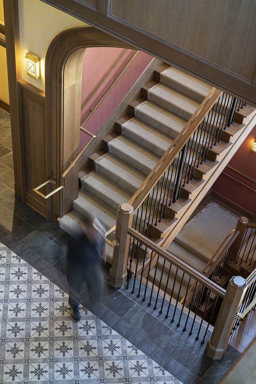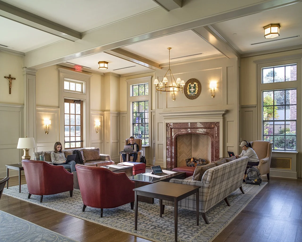 The Collegiate Gothic style carries through to the building’s interior woodwork, details, and light fixtures. A double-height stair hall—paneled in oak, with a tile and stone floor and a beamed ceiling with polychrome panels—connects a 150-seat auditorium and accompanying hall at the lower level, the student lounge on the ground floor, and the office of the Dundon-Berchtold Institute for Moral Formation and Applied Ethics at the upper level.