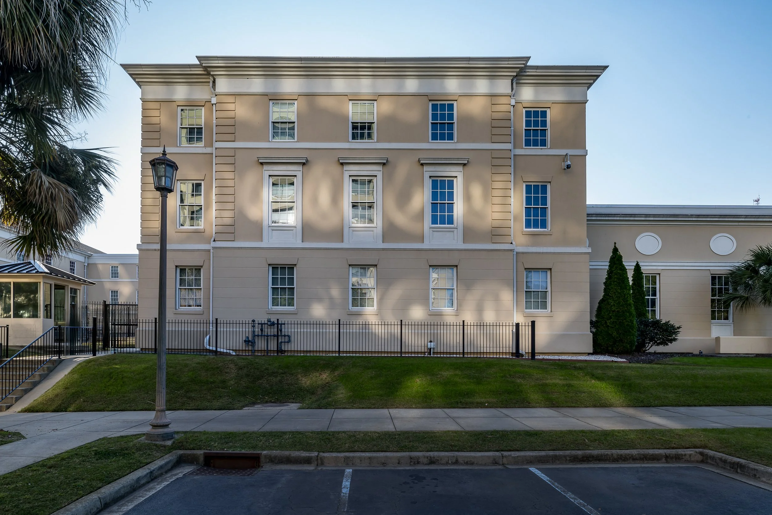 Designed and built for the federal government, and located on the historic campus of the University of South Carolina, the 262,000-square-foot National Advocacy Center is a specialized training facility serving all federal legal employees but primarily the Department of Justice’s nationwide corps of U.S. attorneys. Sited at the dividing line between the historic core of the 1802 campus, with its “horseshoe” lawn ringed by two- and three-story brick and stucco buildings, and the university’s east campus, home to a mismatched collection of post-World War II structures, the new building moved away from the missteps of the university’s recent past: in its composition of pavilioned wings enclosing landscaped courtyards, and its detailing and golden stucco cladding, the center recalls the spare classicism of Robert Mills and Peter Branner, who first shaped the campus.