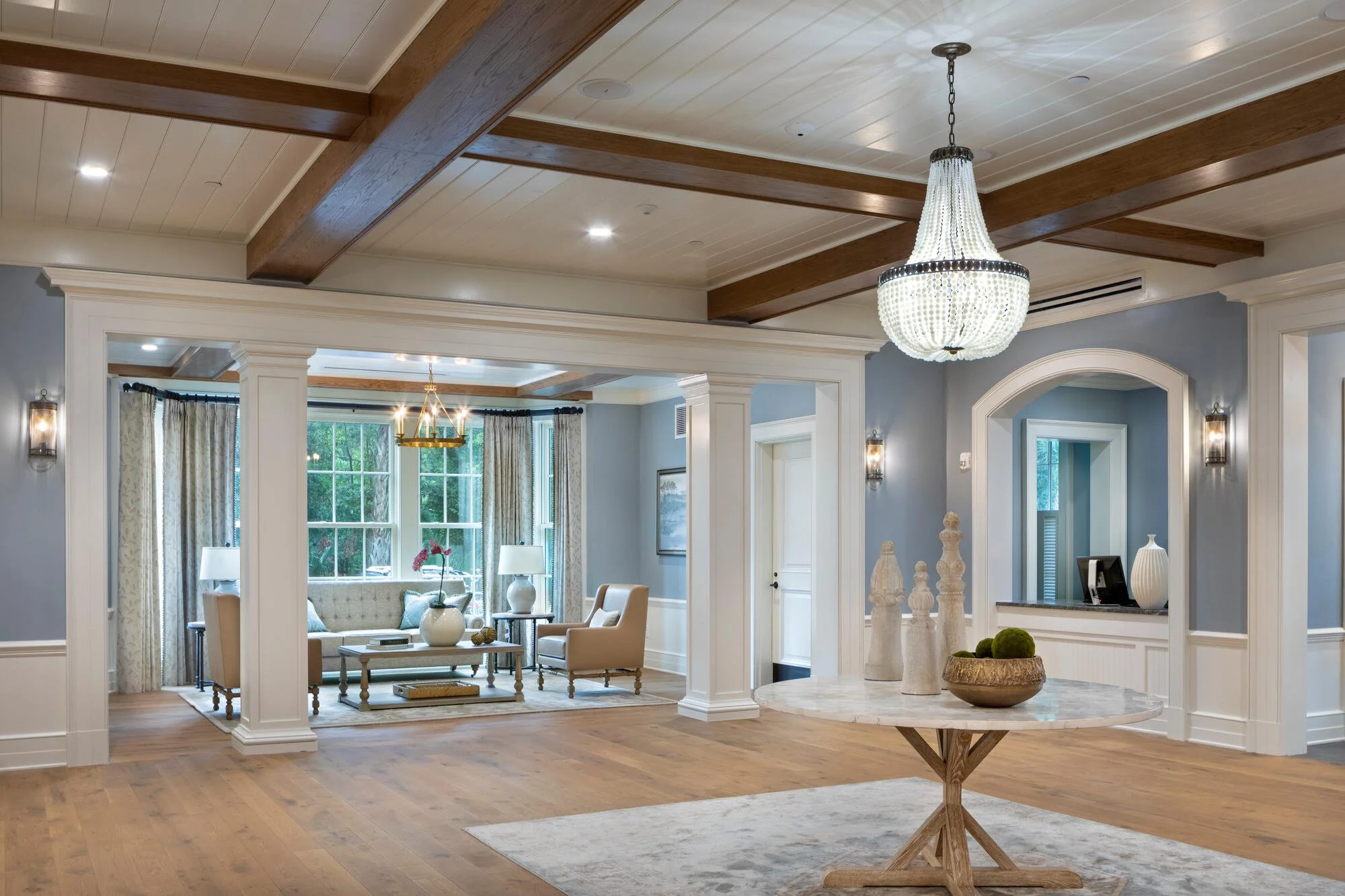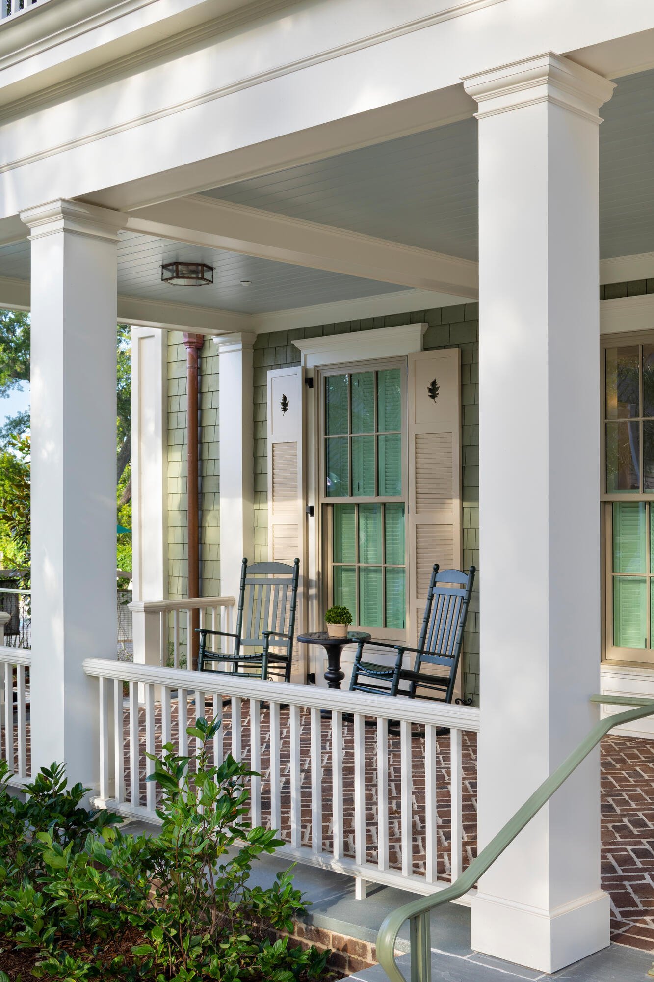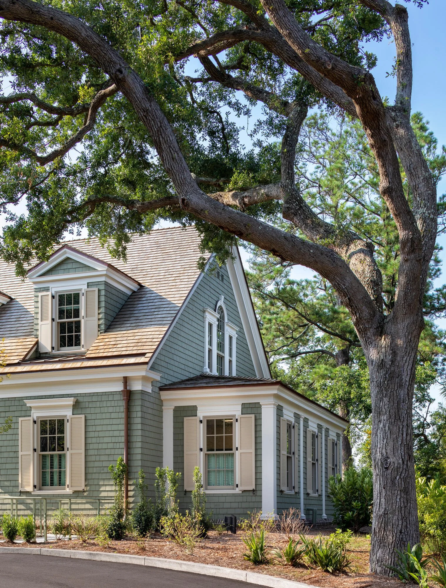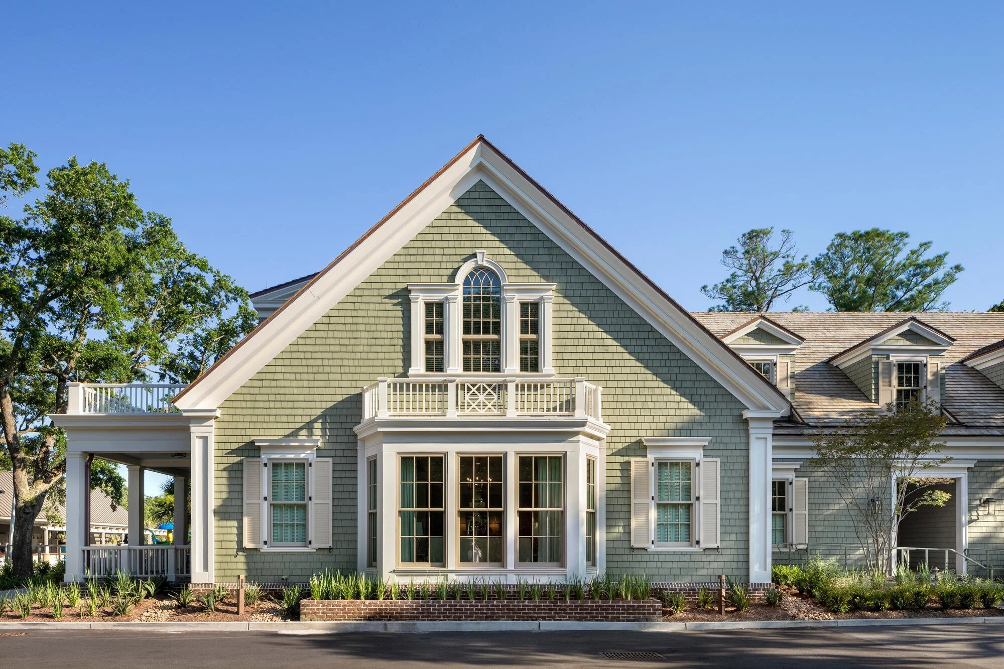 The Kiawah Island Visitor Center serves the resort as well as private homeowners as an arrival point for vacationers who rent houses on the island. Conceived as a house that has been converted to commercial use such as one might find at charming historic villages up and down the East Coast, the visitor center enables guests to check in to the properties they’ll be staying in and orients them to Kiawah’s many attractions. A broad brick-paved porch welcomes visitors to the reception hall; a separate entrance for employees leads to an office wing. Clad in sage-green painted shingles with white-painted classically-inspired trim, the building blends comfortably into its verdant surroundings.