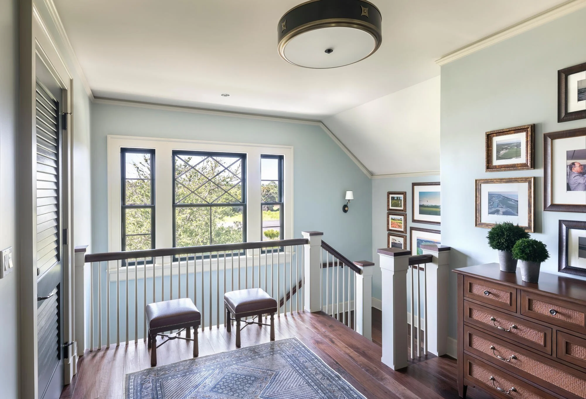 The Cottages at the Ocean Course carry forward the charming Shingle-style character of the Clubhouse, as well as its sensitivity to the natural dunescape along the eastern end of Kiawah Island. Designed to host visiting foursomes, each cottage offers a wood deck walkway leading to a columned porch; inside, a comfortable living room features a fireplace and oversize windows that look out to the driving range and the Atlantic Ocean beyond. Interiors are finished with hardwood flooring, custom wood wainscot, and custom paneling and crowns. A brick and bluestone terrace at each cottage offers comfortable seating surrounded by custom railings and lanterns. Each cottage provides four bedrooms with en-suite baths, accommodating up to eight guests.