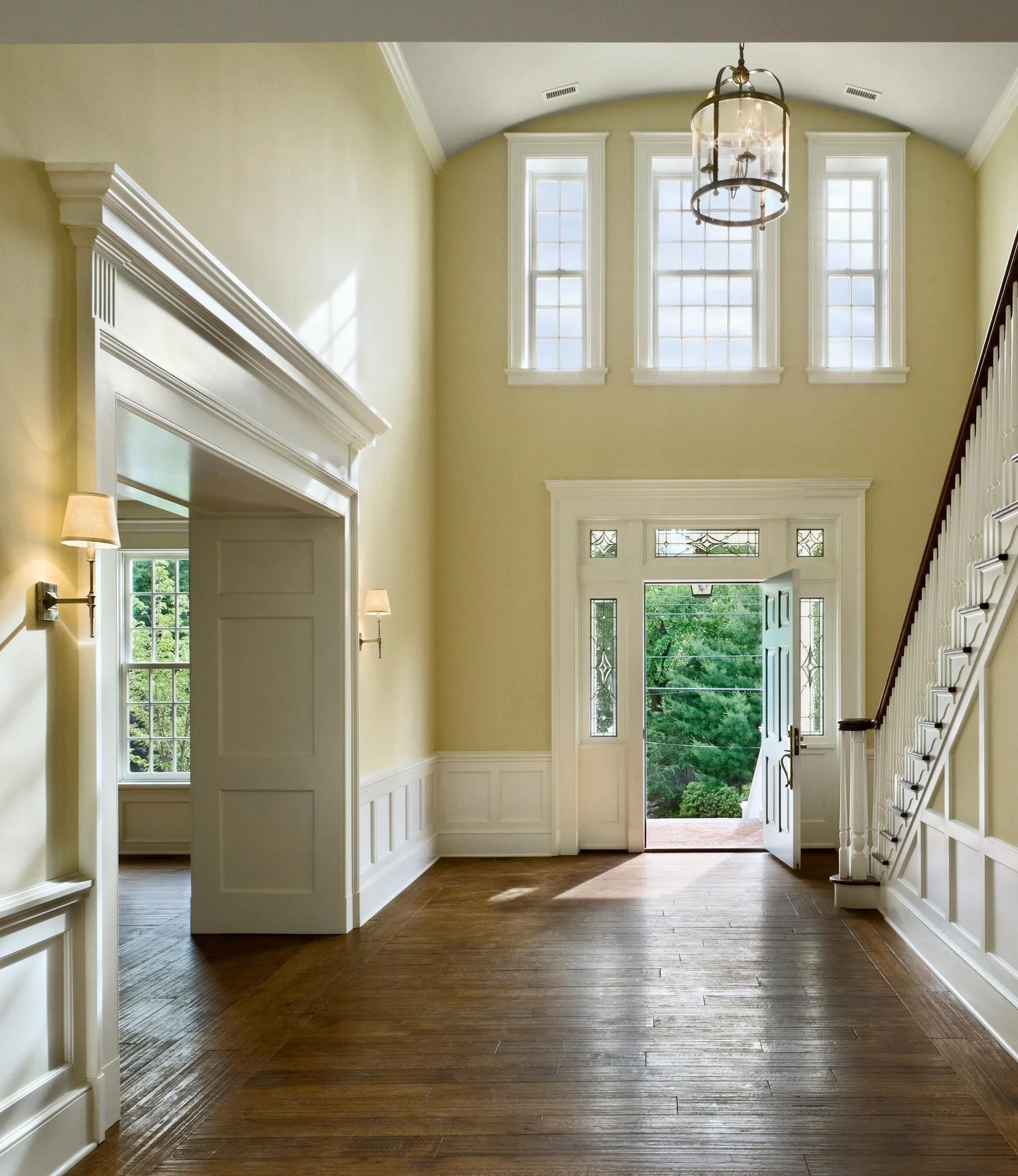 The Colonial Revival house, clad in white-stained shingles with green operable shutters and a slate roof, presents a formal, symmetrical face to the street. The garden front is more casual, with a pergola-shaded terrace embraced by two two-story bays opening to a manicured lawn punctuated by a dramatic rock outcrop. To one side, a pool house, conceived as a later addition to the house with a Palladian-inspired porch, opens to a grassy pool terrace. Inside, the first floor accommodates a living room, a dining room, a library, a private study, and a large kitchen that opens to a sunny family room; the lower level provides a game room, a gym, and a wine cellar. Upstairs, the principal bedroom suite includes a sitting room, a capacious bath, and two walk-in closets. Four additional bedrooms, each with an en-suite bath, occupy the second floor. The dormered third floor offers one more bedroom together with its own sitting room and bath.