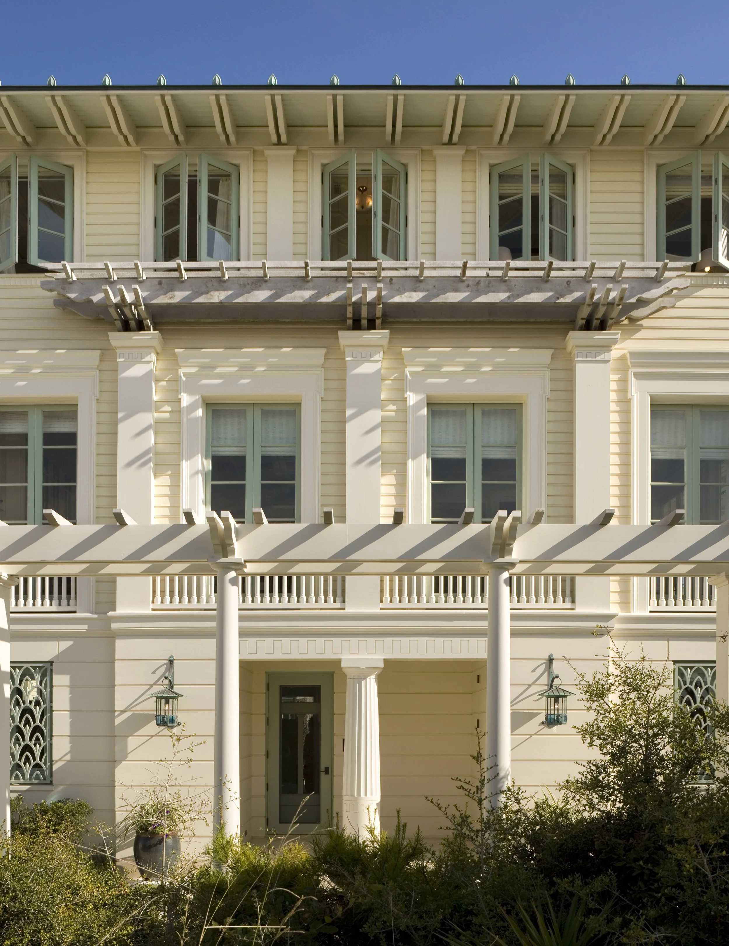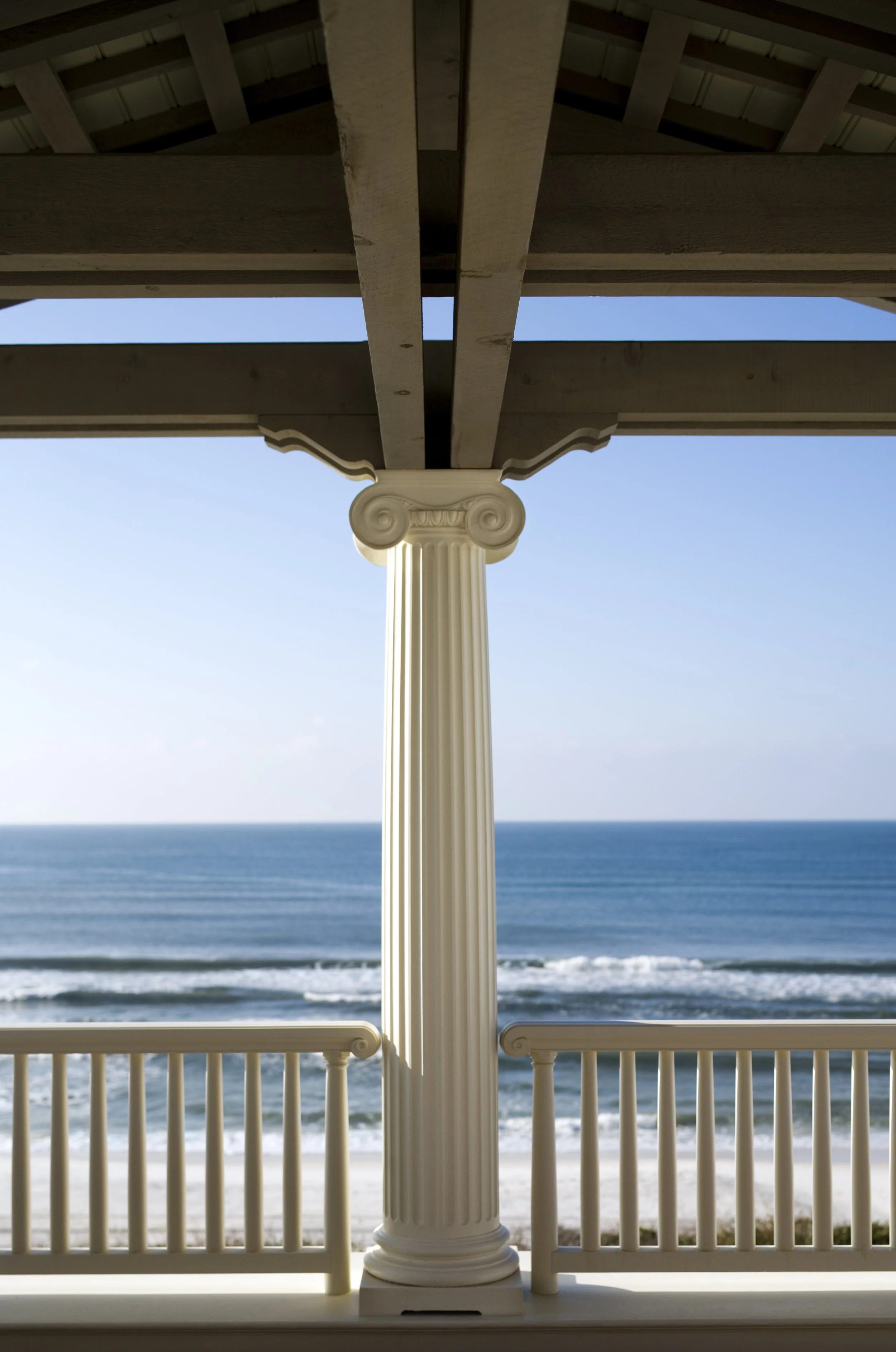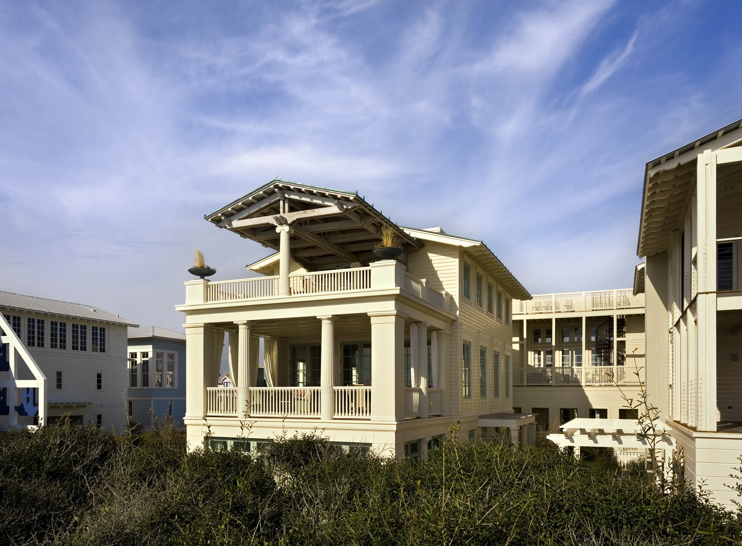This 2,700-square-foot oceanfront house, balancing vernacular charm and high-style Classicism, establishes its own identity while adhering to the town of Seaside's strict design guidelines. The compact plan looks to the traditional urban townhouse model but employs a side entry through the garden. Children's bedrooms are located at the ground level with a screened porch facing the dune; the great room on the piano nobile above opens to another porch overlooking the ocean. The master bedroom suite, with sweeping vistas of both the town and the ocean, occupies the third level, its porch displaying the single Ionic column that gives the house its iconic presence and affords clear diagonal views along the surf. Combining a casual beach vibe with imaginative details inspired by Swedish Classicism, this award-winning house earned high praise from Andrés Duany and Elizabeth Plater-Zyberk—the architect-planners of the groundbreaking New Urbanist community in which it stands—and made the cover of Architectural Digest soon after its completion.