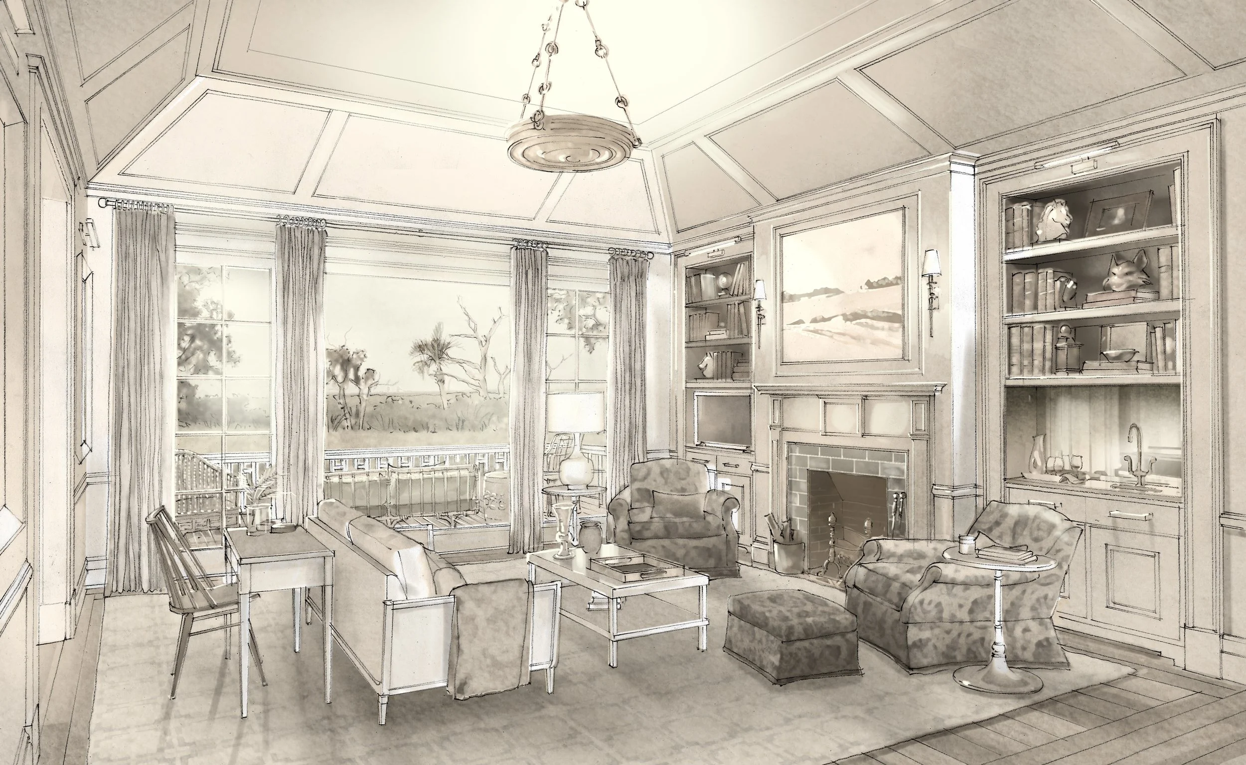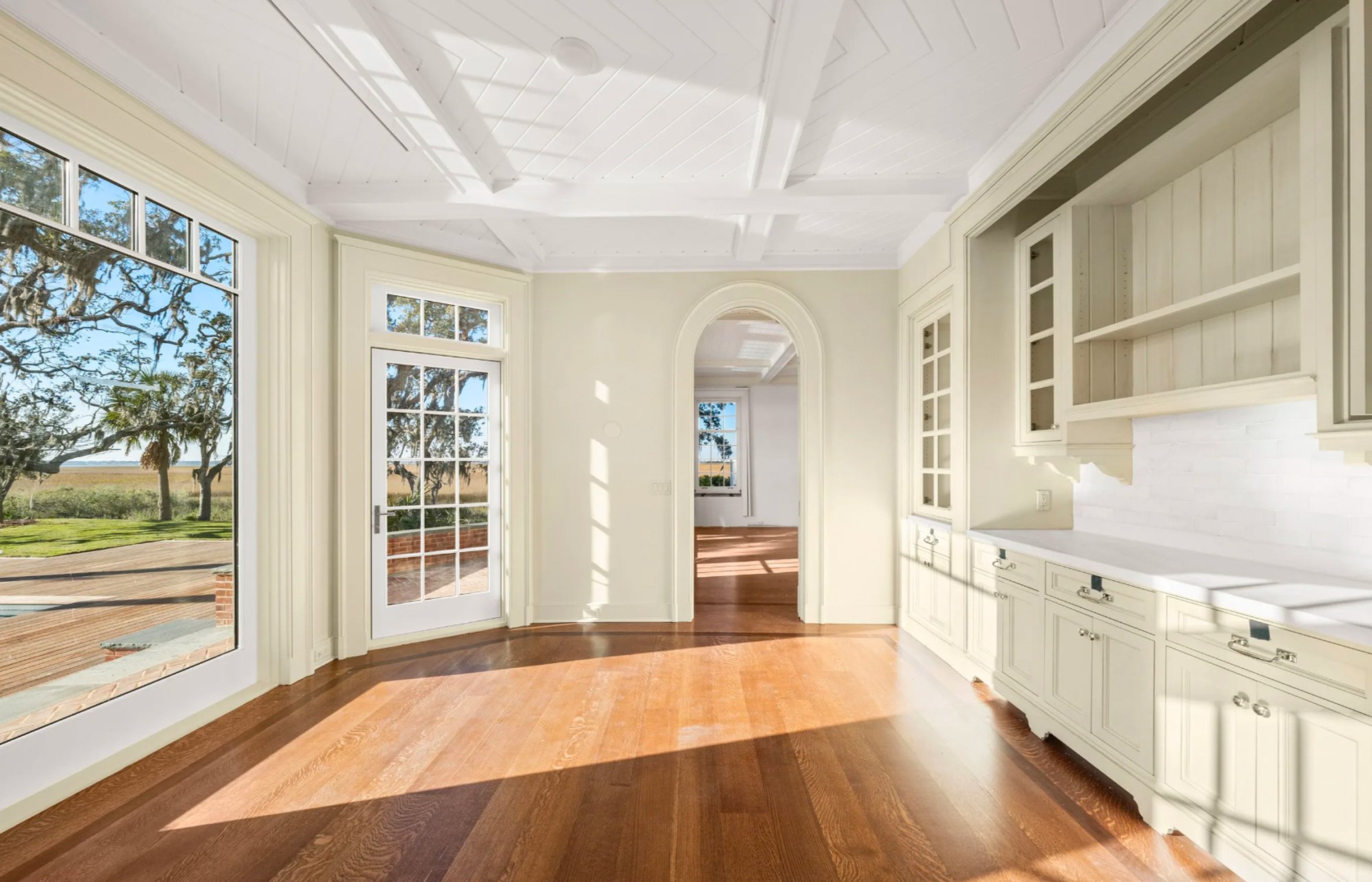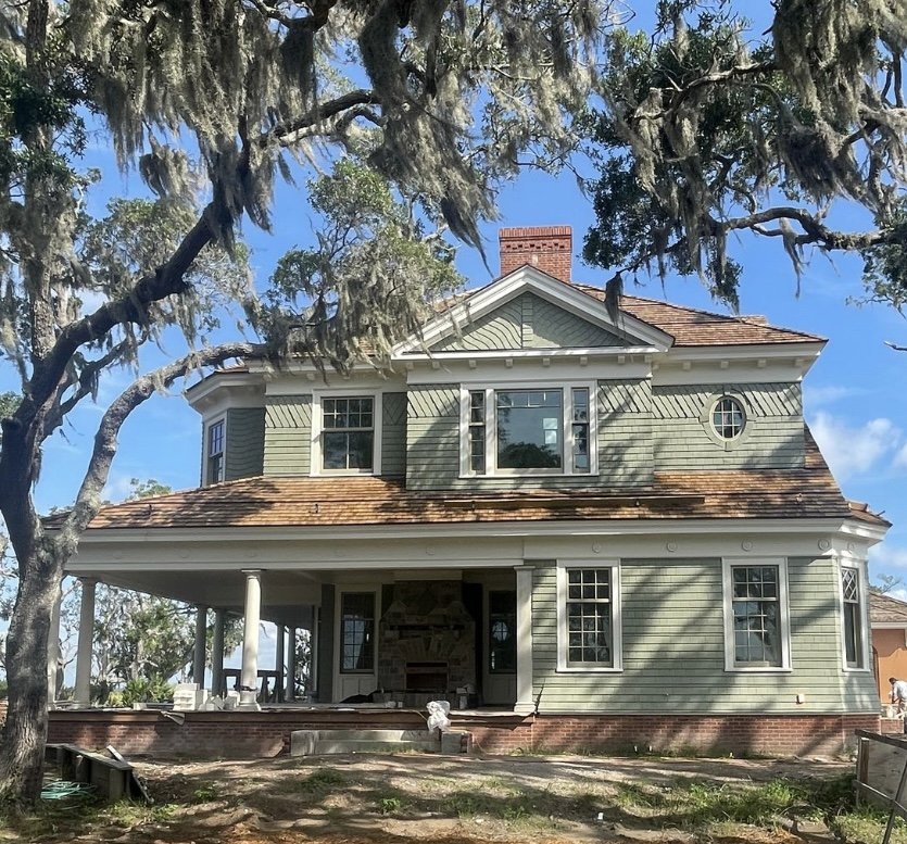 Designed for a spectacular site on Georgia’s St. Simons Island, this 10,000-square-foot double-gabled house is sensitively sited to preserve the property’s mature live oaks, as well as to favor a sweeping vista across the Mackay River to the romantic marshes of Glynn and the dramatic Sidney Lanier Bridge in the distance. A winding drive leads to a welcoming pedimented entry porch. The major first-floor rooms—living, dining, family, and library, as well as the broad wraparound porch—are all oriented to views across the water. Upstairs, the principal bedroom suite features a sitting room that opens to an upper porch also facing the river. Gardens, a pool, and a pickleball court are nestled into the landscape. The fancy-cut shingle facades are stained sage green to harmonize with the surrounding foliage.