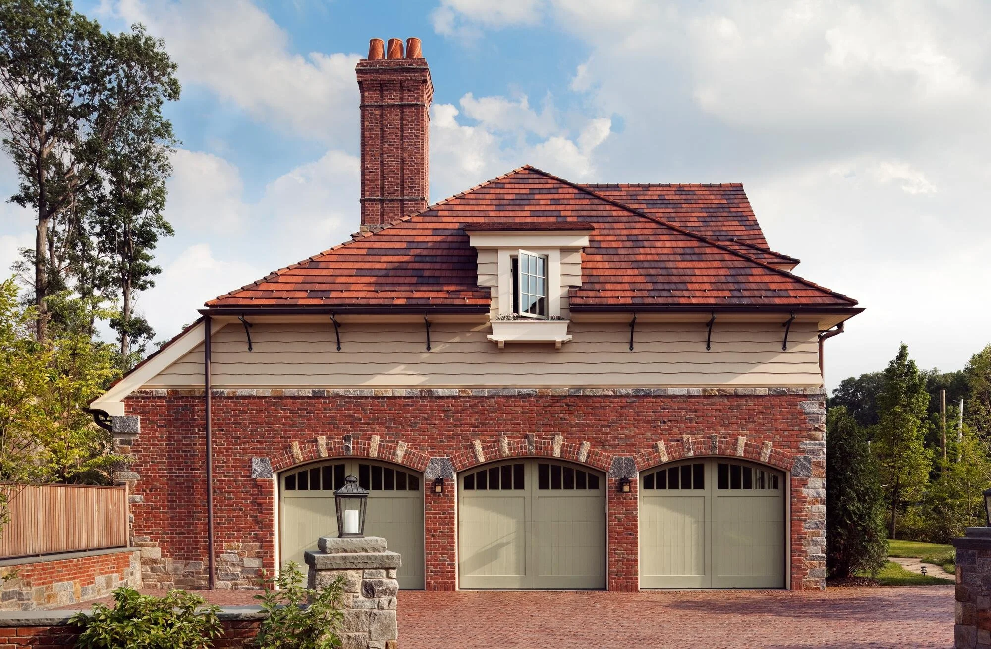 This 11,000-square-foot house is inspired by the Arts & Crafts movement, and by its leading practitioners such as the English architects Richard Norman Shaw and C.F.A. Voysey. With brick trimmed with stone on the first floor, stucco trimmed with brick and half-timbering above, and a Ludowici clay-tiled roof, the house presents a rustic, hand-hewn aspect appropriate to its hilltop site. The ground floor accommodates a living room, a formal dining room, a library, and a kitchen that opens to a family room; French doors open the family room to a bluestone-paved porch and a private lawn. The primary bedroom suite includes a sitting room with a fireplace, two walk-in closets, and a well-appointed bath. The second and third floors offer five additional bedrooms. The three-car garage wing accommodates a cabana facing the pool terrace.