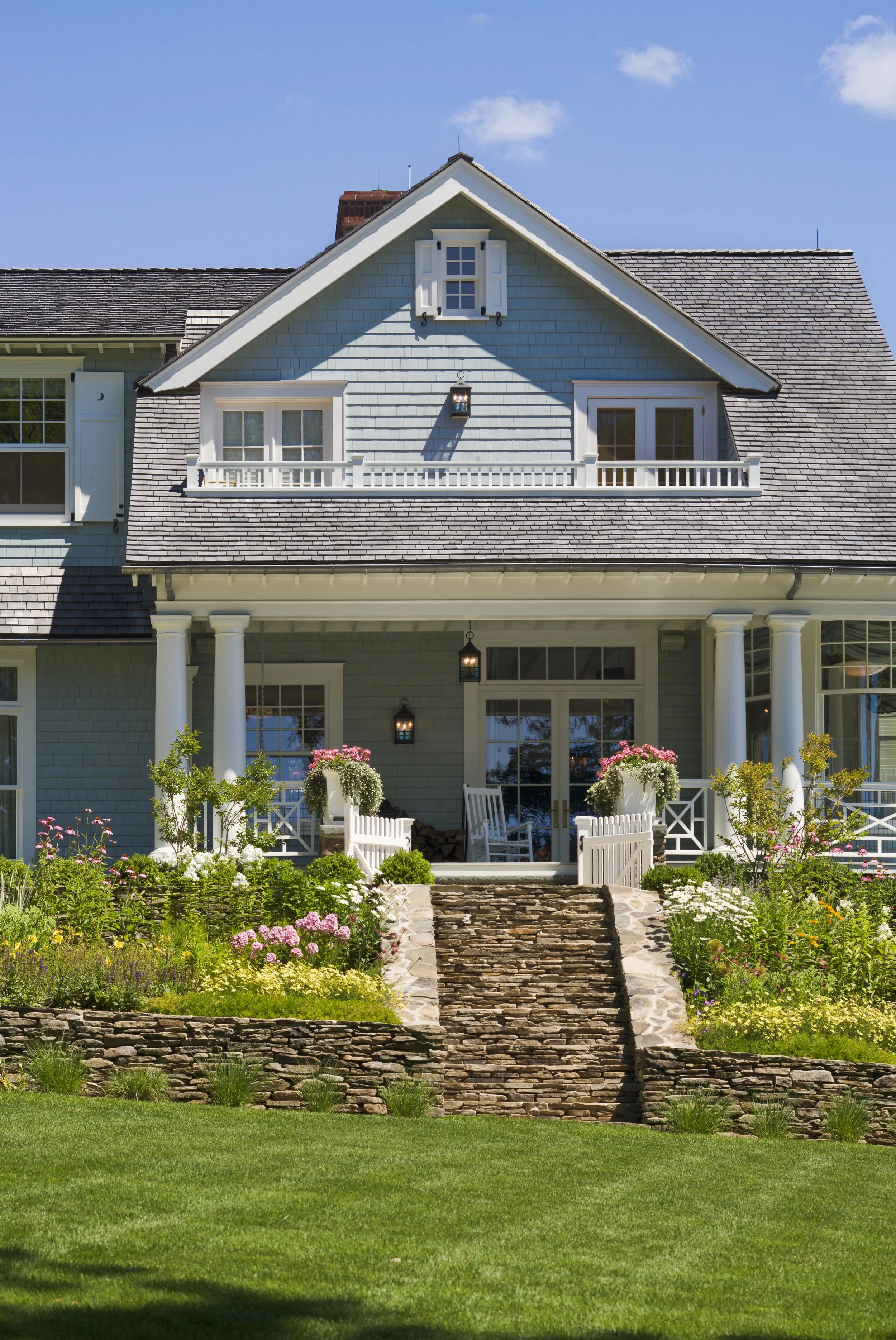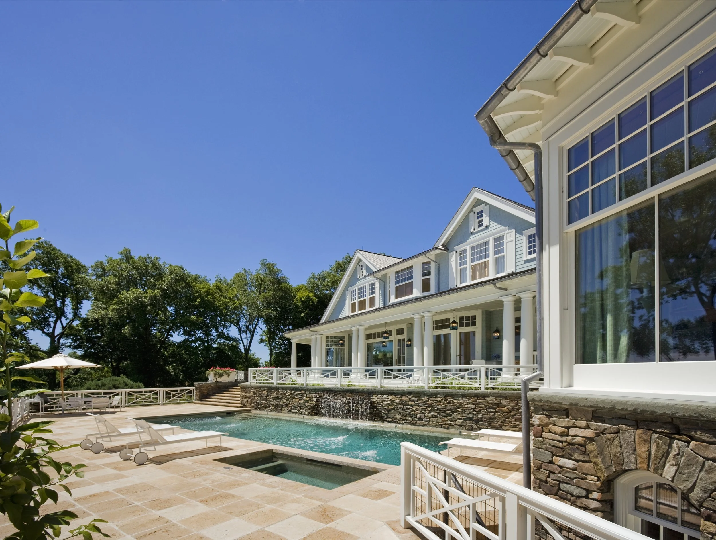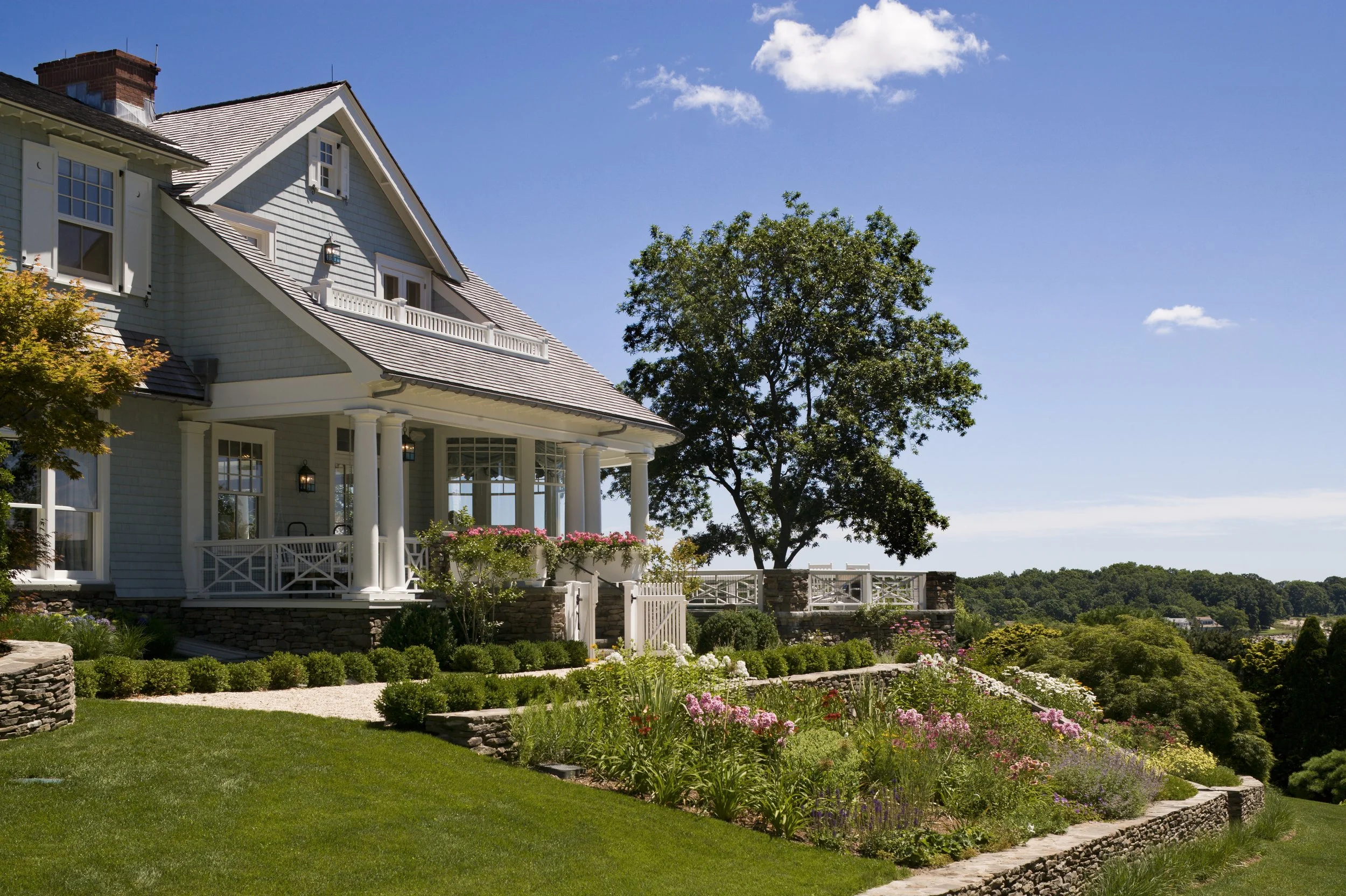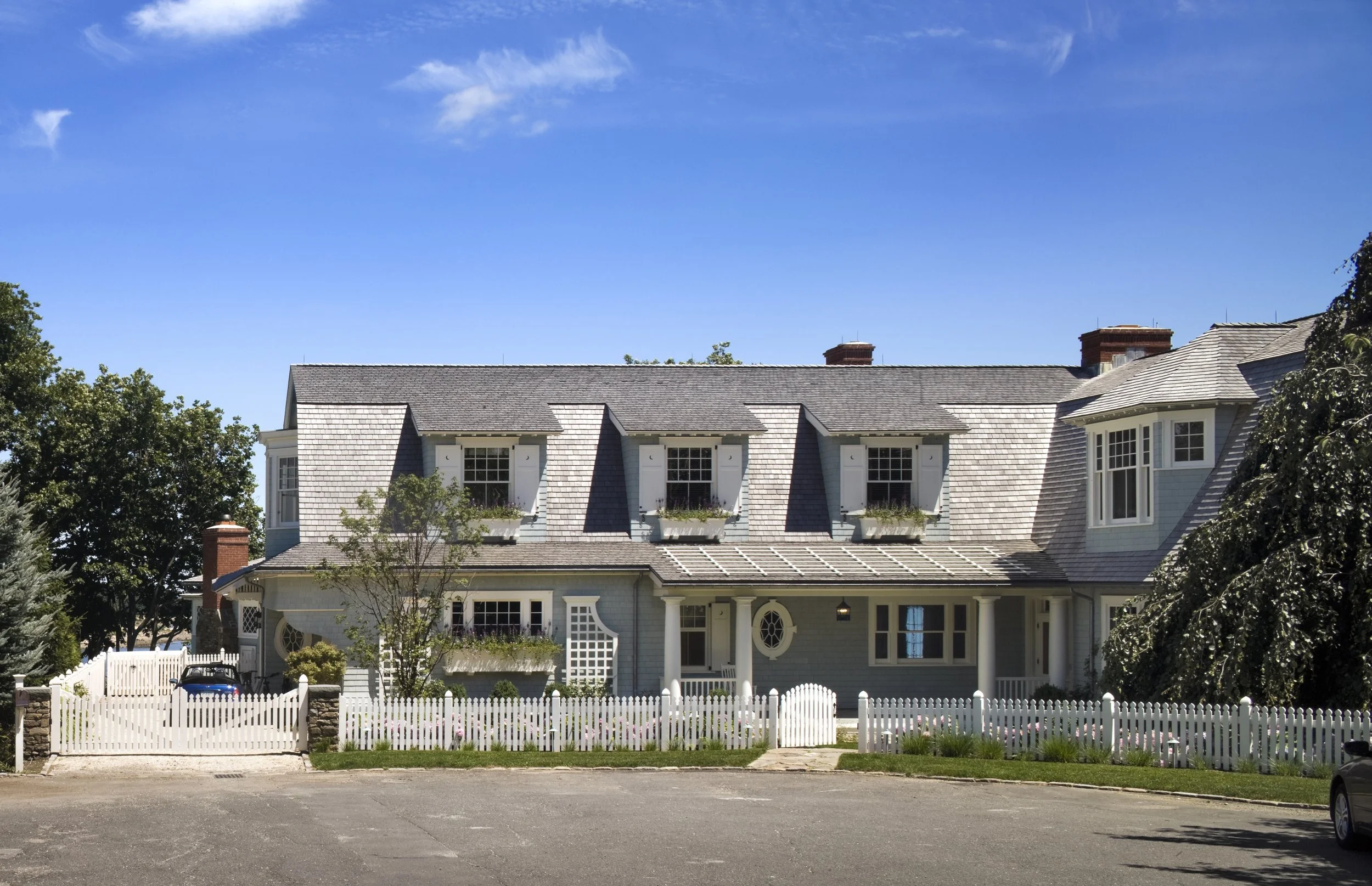 This Shingle-style house, perched on an extraordinary site 300 feet above Compo Beach, orients principal rooms and porches to views of Long Island Sound and Sherwood Island. The site had been occupied by a small and undistinguished 1960s house and is encumbered by zoning rules including strict height limitations, accommodated by putting the upper floor under a gambrel roof with picturesque gables and dormers. The L-shaped house embraces an existing swimming pool; a gently sloping family lawn and garden were created to the south. Large windows and doors bring the views inside, and fireplaces anchor the living room, dining room, and family room, which are organized around a large central stair hall. Sky-blue stained shingles, leaded hand-blown glass, and white-painted shutters and window boxes at the double-hung windows give the house a casual feel reminiscent of early twentieth-century beach houses in Maine or Nantucket.