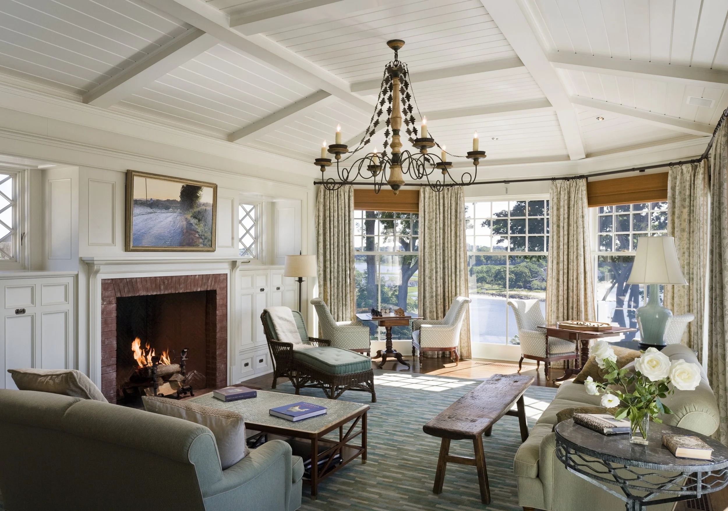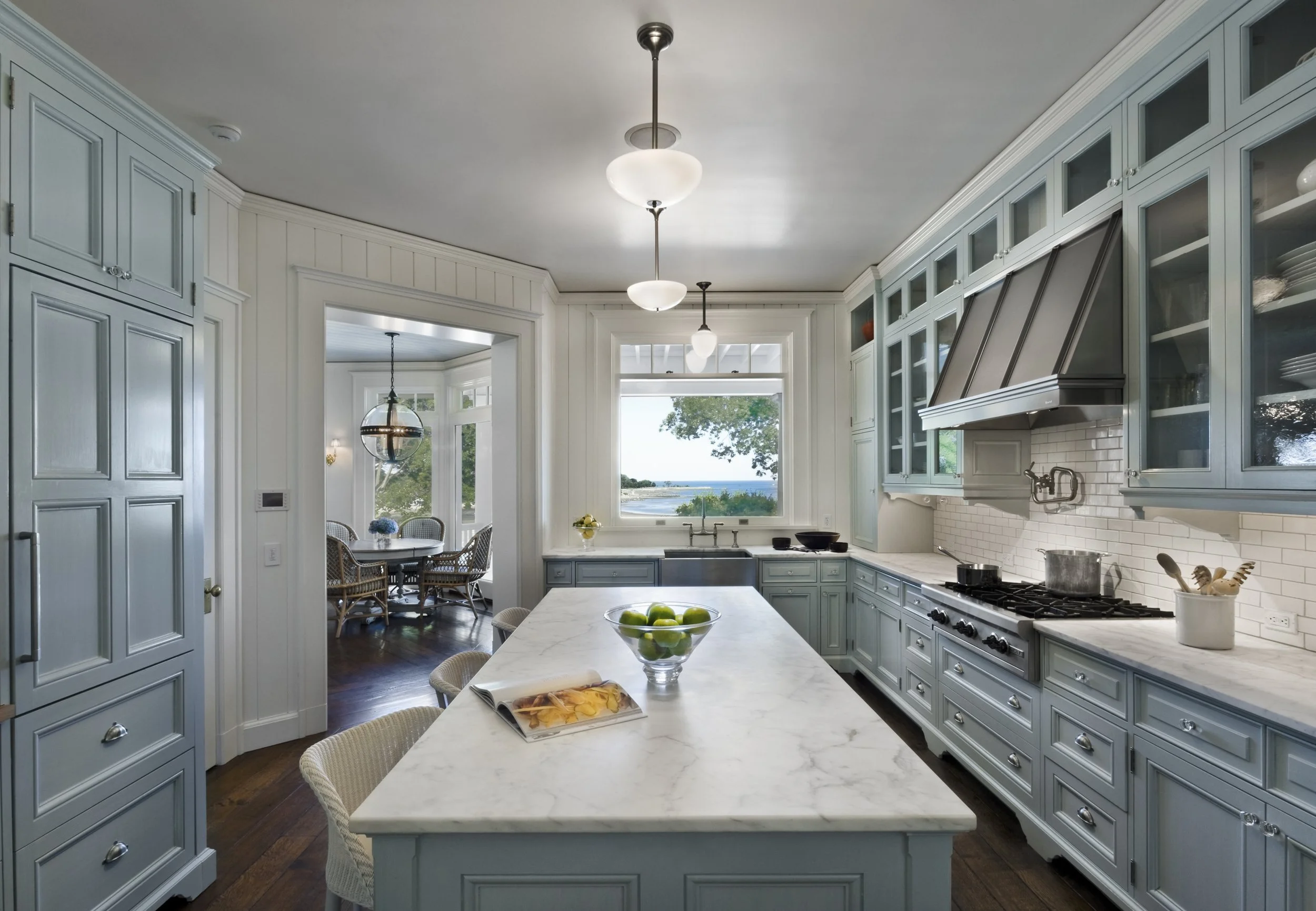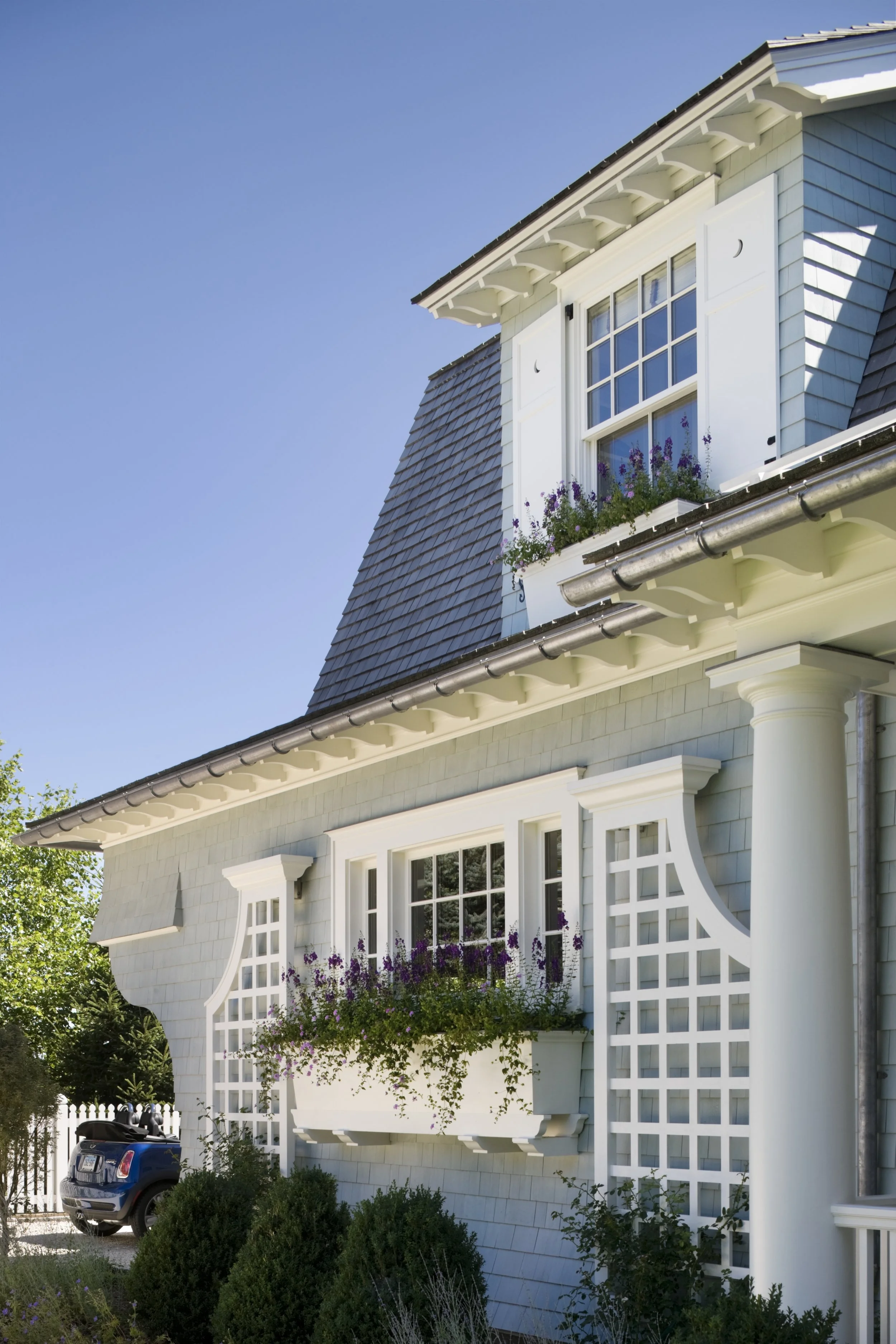 This Shingle-style house, perched on an extraordinary site 300 feet above Compo Beach, orients principal rooms and porches to views of Long Island Sound and Sherwood Island. The site had been occupied by a small and undistinguished 1960s house and is encumbered by zoning rules including strict height limitations, accommodated by putting the upper floor under a gambrel roof with picturesque gables and dormers. The L-shaped house embraces an existing swimming pool; a gently sloping family lawn and garden were created to the south. Large windows and doors bring the views inside, and fireplaces anchor the living room, dining room, and family room, which are organized around a large central stair hall. Sky-blue stained shingles, leaded hand-blown glass, and white-painted shutters and window boxes at the double-hung windows give the house a casual feel reminiscent of early twentieth-century beach houses in Maine or Nantucket.