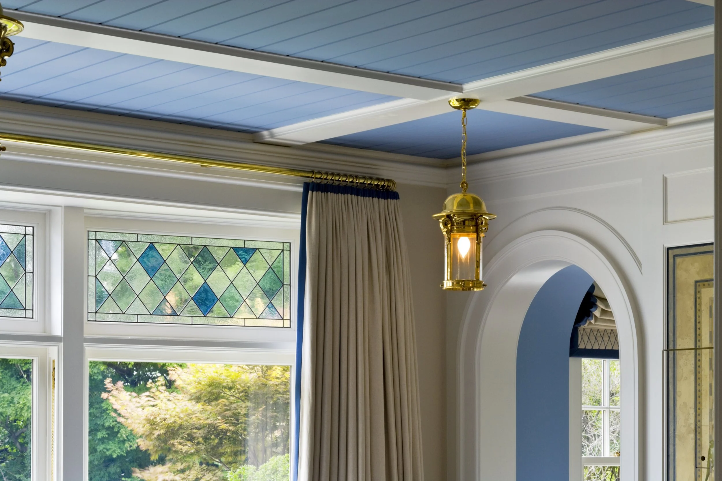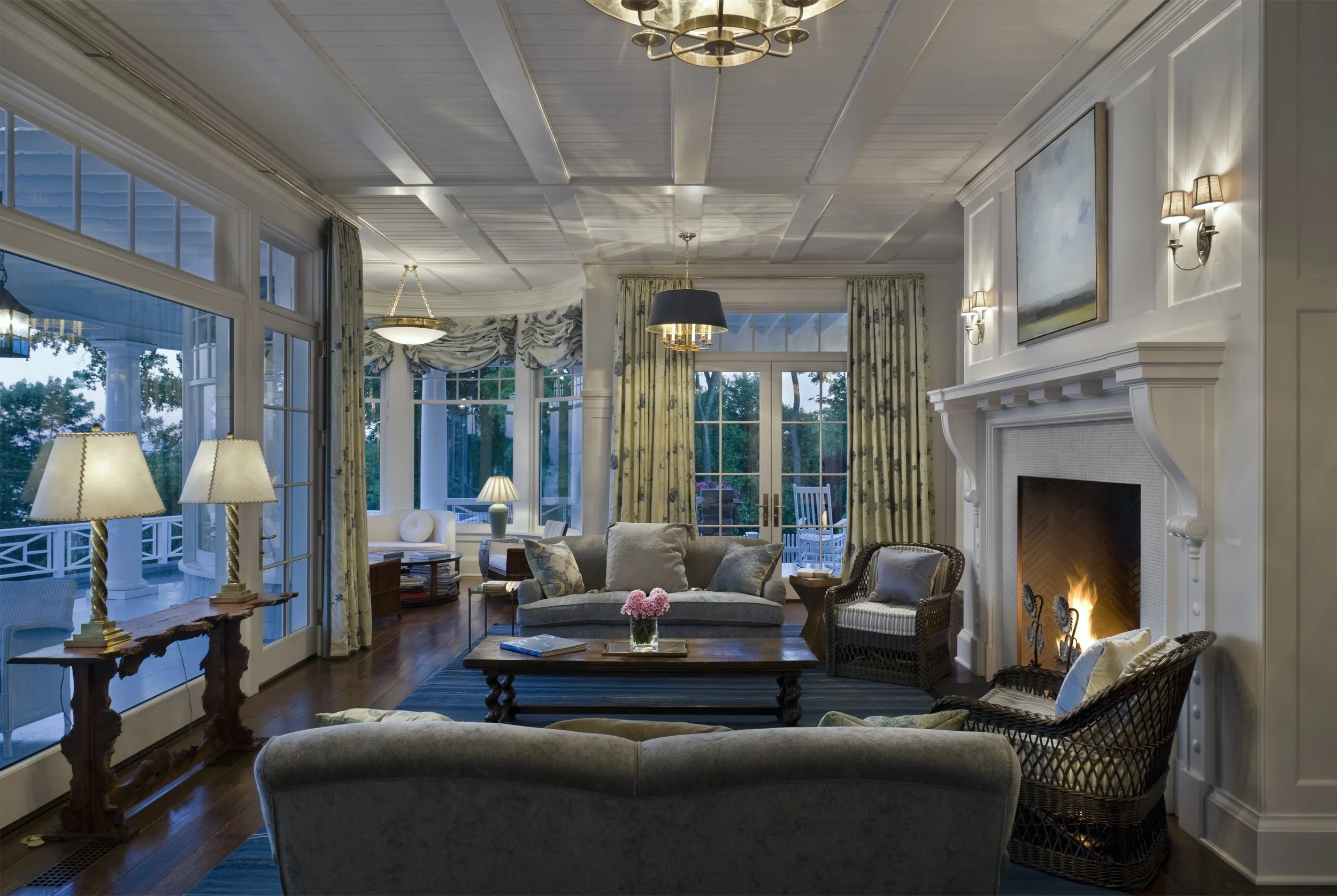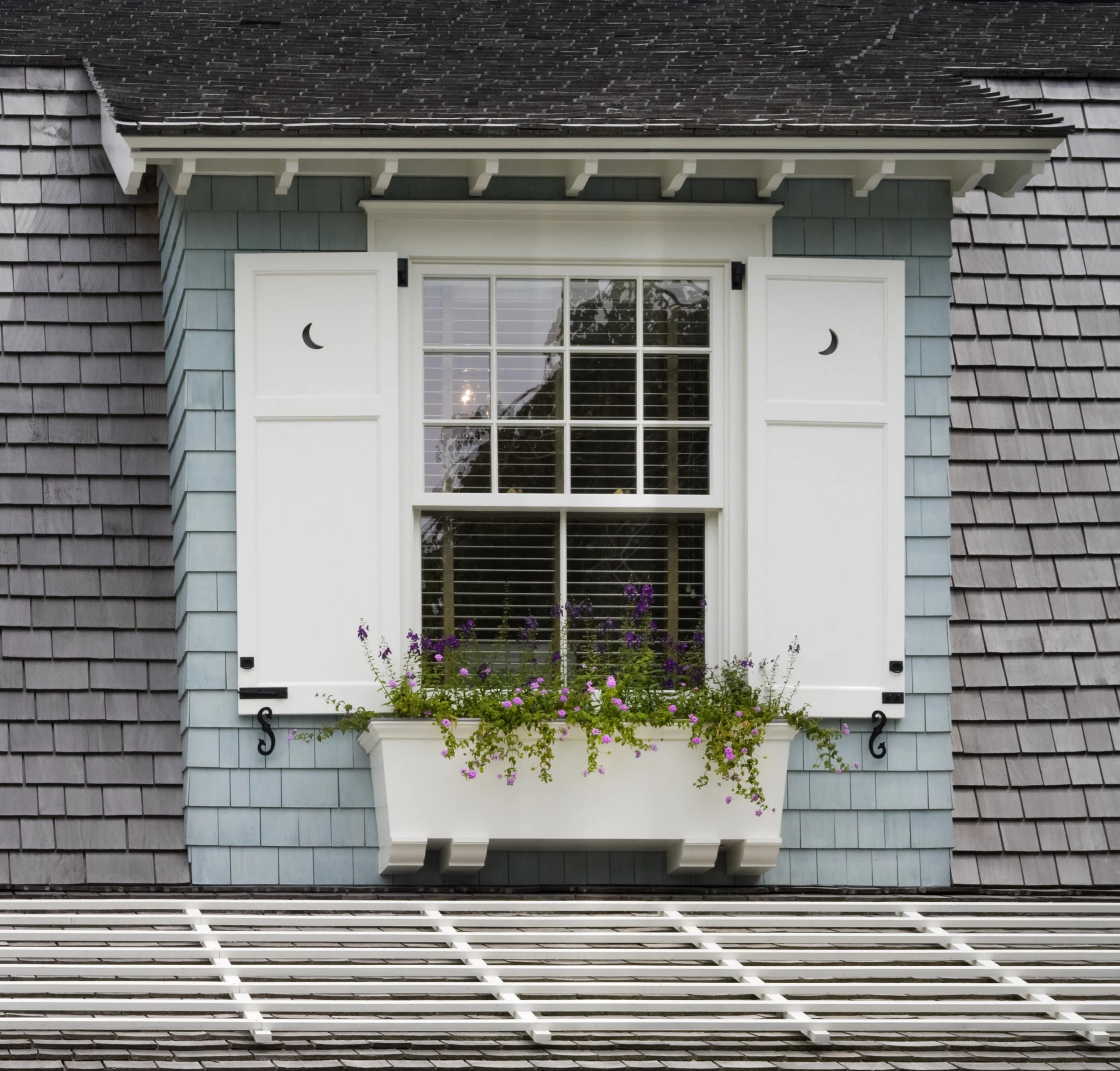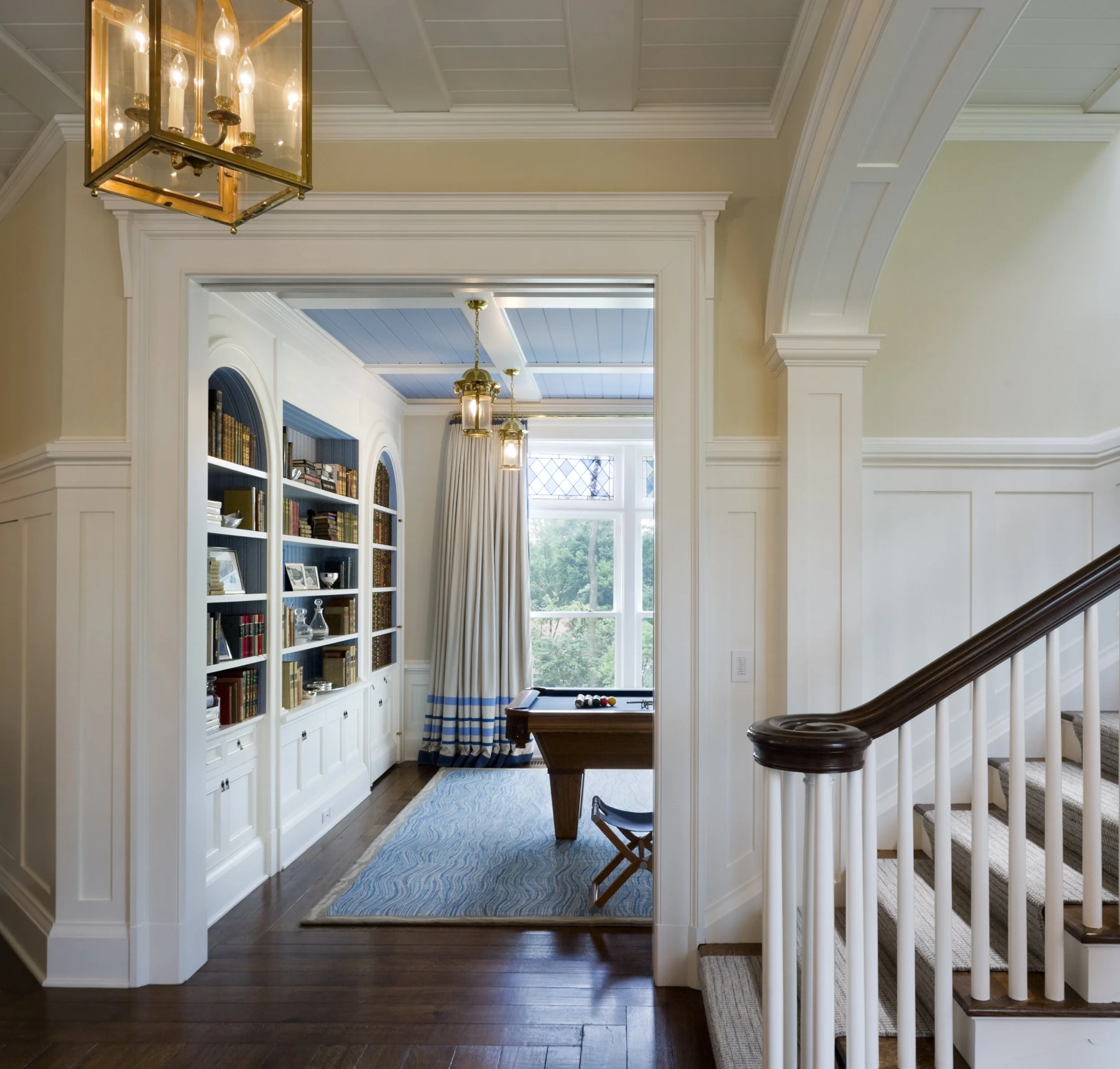 This Shingle-style house, perched on an extraordinary site 300 feet above Compo Beach, orients principal rooms and porches to views of Long Island Sound and Sherwood Island. The site had been occupied by a small and undistinguished 1960s house and is encumbered by zoning rules including strict height limitations, accommodated by putting the upper floor under a gambrel roof with picturesque gables and dormers. The L-shaped house embraces an existing swimming pool; a gently sloping family lawn and garden were created to the south. Large windows and doors bring the views inside, and fireplaces anchor the living room, dining room, and family room, which are organized around a large central stair hall. Sky-blue stained shingles, leaded hand-blown glass, and white-painted shutters and window boxes at the double-hung windows give the house a casual feel reminiscent of early twentieth-century beach houses in Maine or Nantucket.