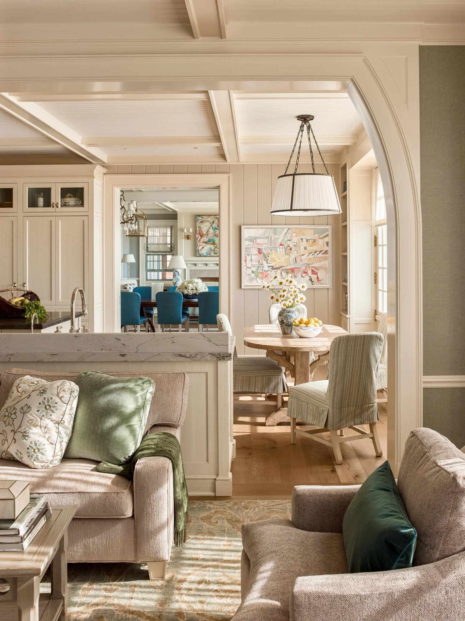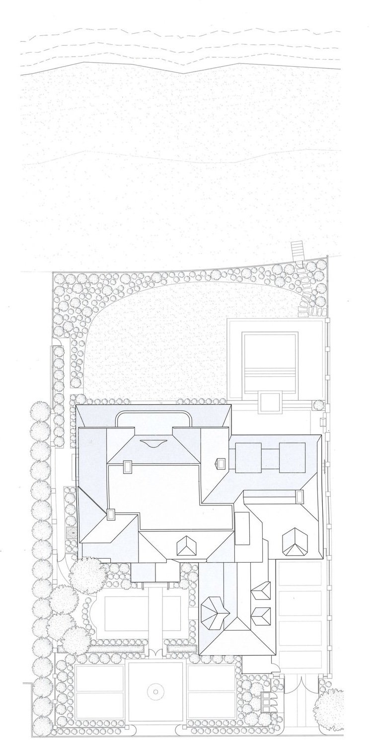 Longtime residents of Virginia Beach, and active in the community, the clients for this project had always wanted to live on the ocean. They envisioned their new house as their primary residence, as comfortable for two as it would be for twelve when serving as a gathering place for their three grown children, significant others, and friends. Their site, at just three-eighths of an acre, called for a house that would both fit in with the scale of the neighborhood and exemplify the quality and style of turn-of-the-twentieth-century houses. The entry sequence proceeds from a motor court through a garden, across a porch, and into the stair hall. Off the stair hall is the combined living / dining room; a pine-paneled den does double duty as guest quarters. The kitchen and family room connect to the dining room as well as to the stair hall and the mud room. The second floor is organized as three zones: a sitting room which can be closed off using pocket doors to function as an upstairs living room, a primary bedroom suite with ocean views, and the children's rooms, each with its own bath and walk-in closet.