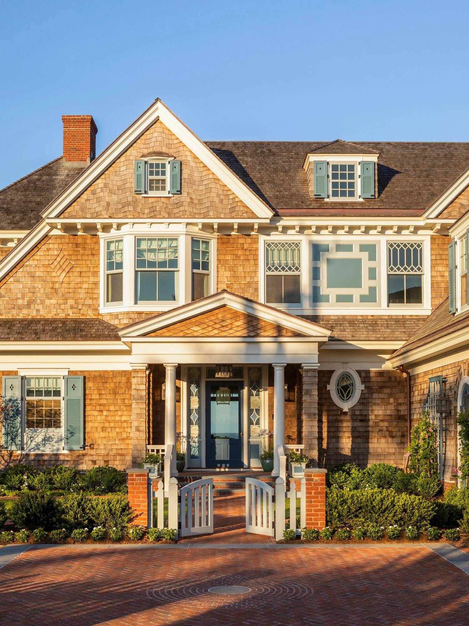 Evocative details abound: cottage-like arched portals, paneled doors with stained-glass sidelights; oval and diamond windows juxtaposed with larger bays, and picture windows with muntins or edged with smaller panes. Even the shingles offer endless opportunities for ornamentation: every fourth course is narrow, endowing the facades with a pleasant rhythm, which is further elaborated by diamond and wave-patterned inserts.