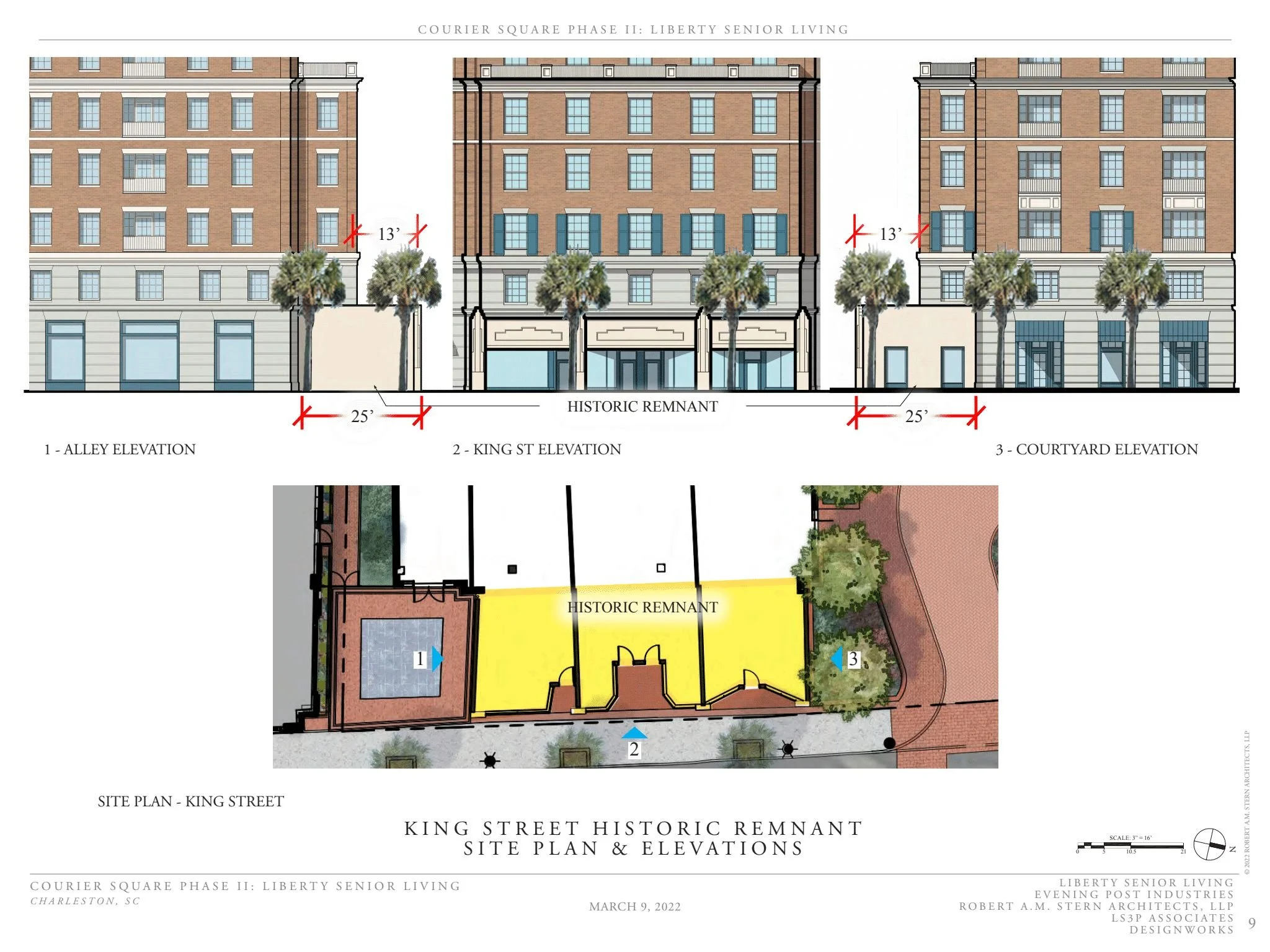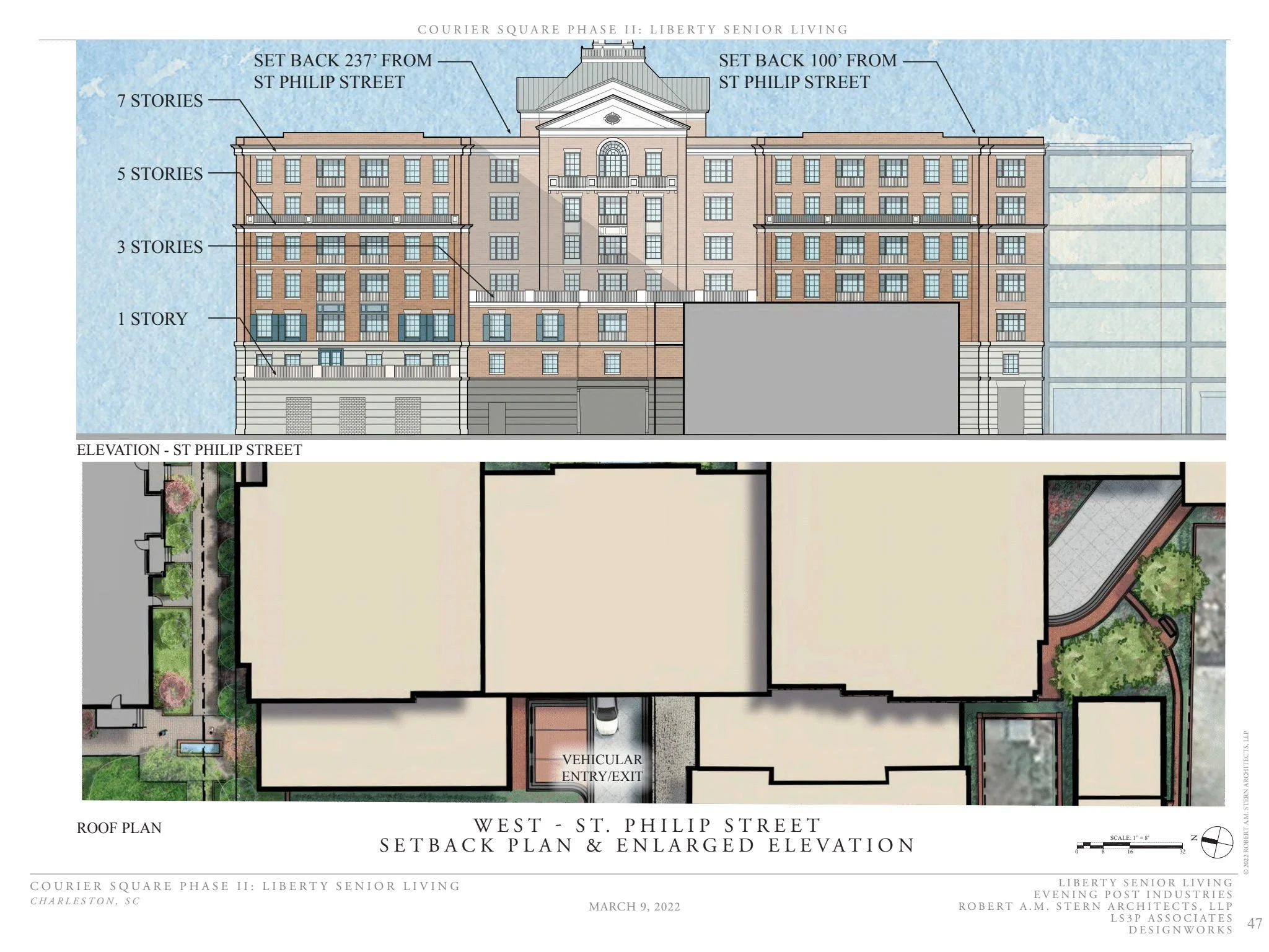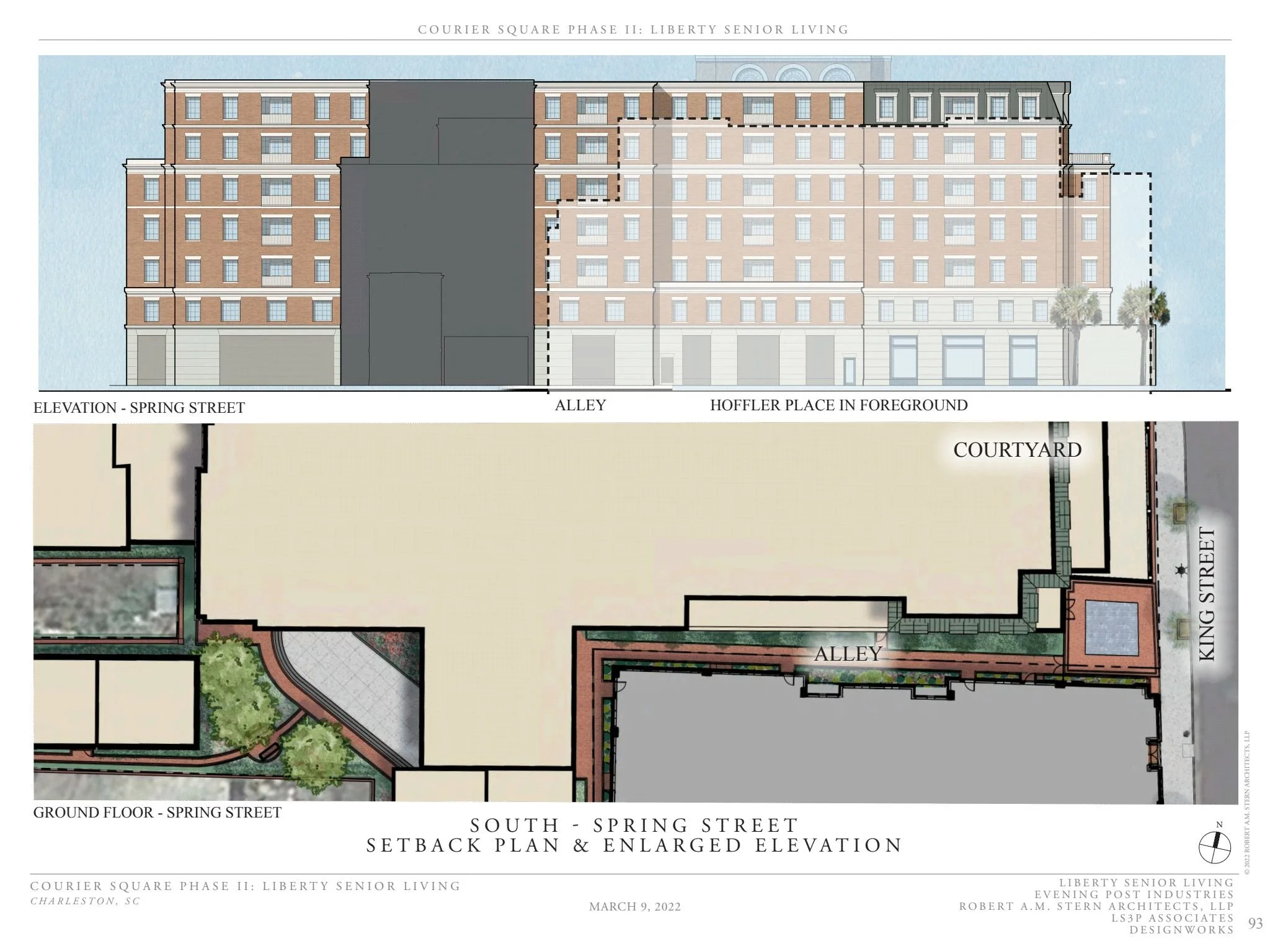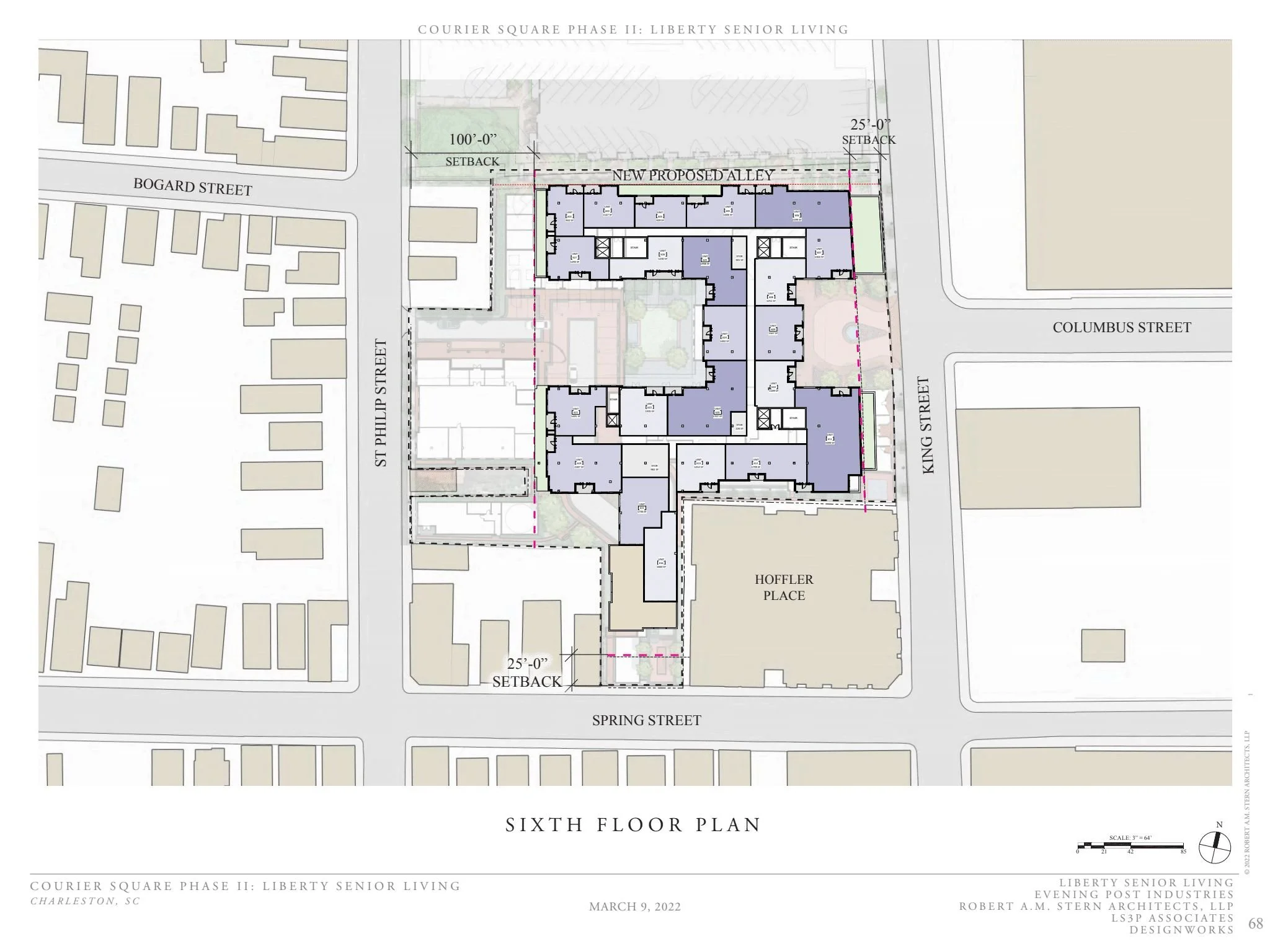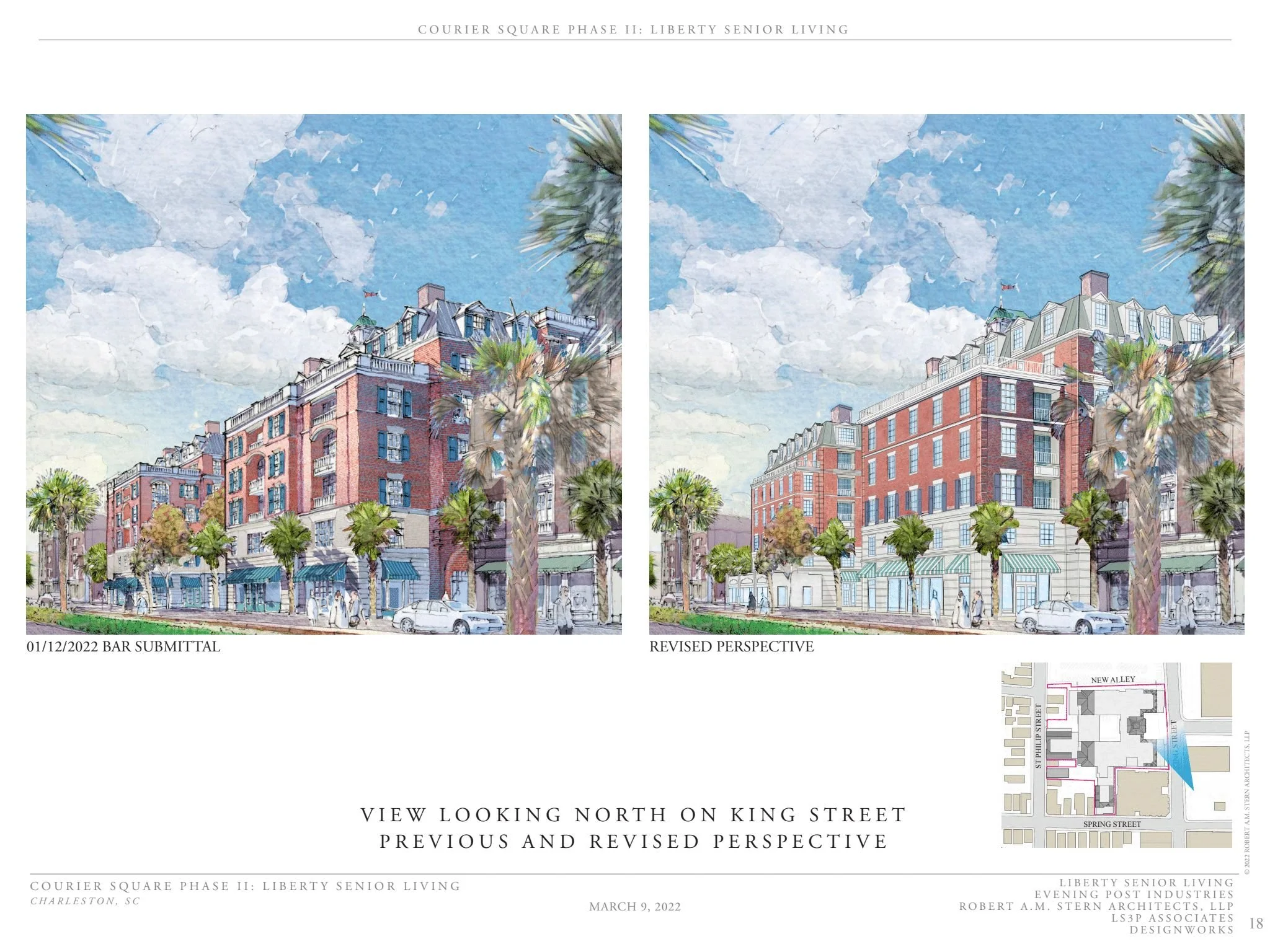 Located on Charleston’s King Street, this new building provides more than 140 senior-living condominium apartments in a building that respects the cherished architectural heritage of its historic city. The building terminates the axis of Columbus Street with a garden-like entry motor court at the street and a signature tower above. The contextually appropriate Georgian expression along King Street features clapboard on the shopfronts and brick on the residences above; top-floor apartments are tucked into a dormered mansard. On the west side, where the building faces a neighborhood of two- and three-story houses, the structure steps down in scale and facades are clad in clapboard. Porches and balconies enliven the composition, further reducing the visual mass and providing outdoor spaces, many with river views, to the apartments. A historic single-story Art Deco building has been relocated and incorporated into the scheme, and an integrated medical facility enjoys its own courtyard. The design was approved by Charleston’s Board of Architectural Review, which awarded the project an extra story for architectural merit.