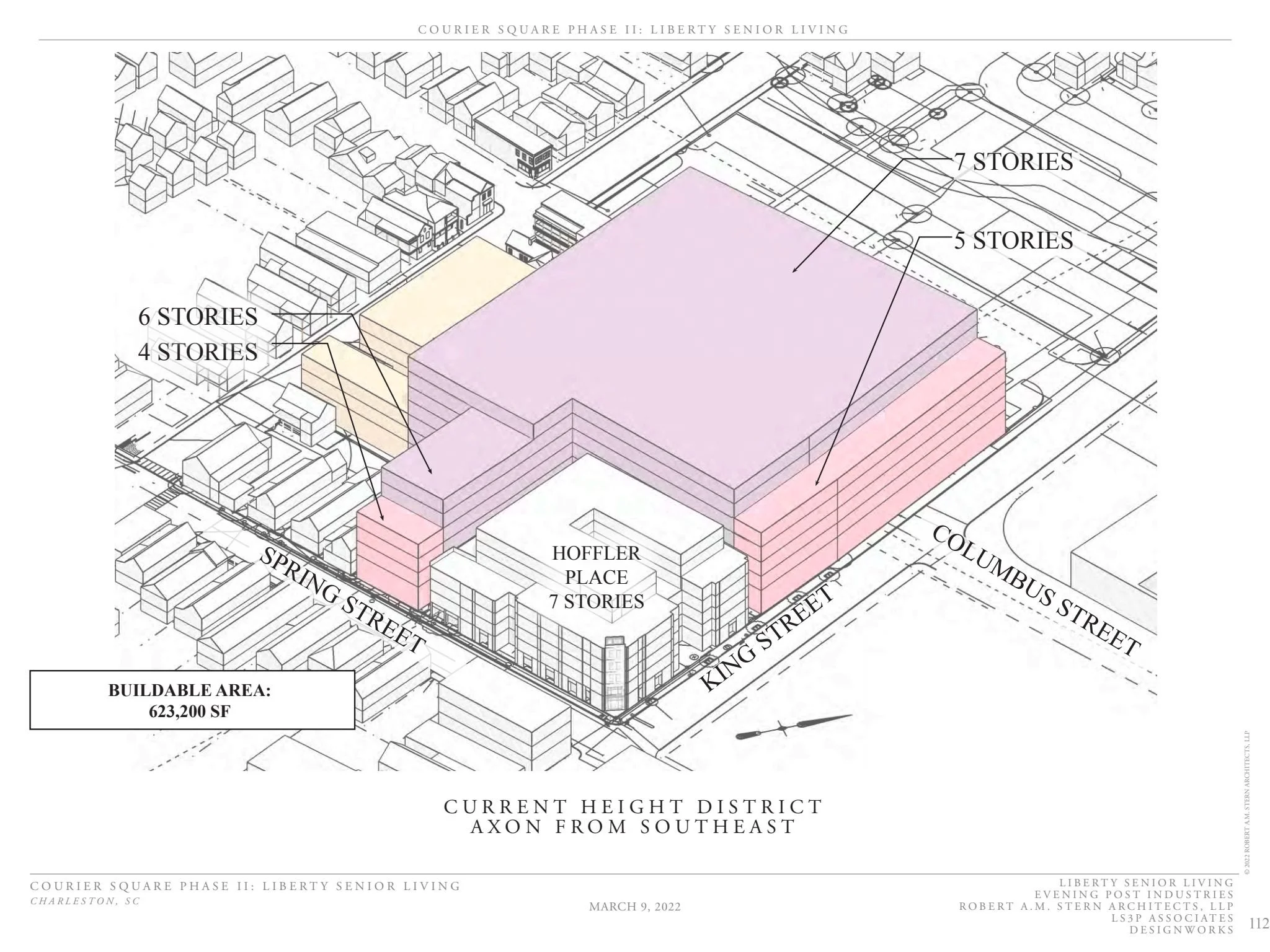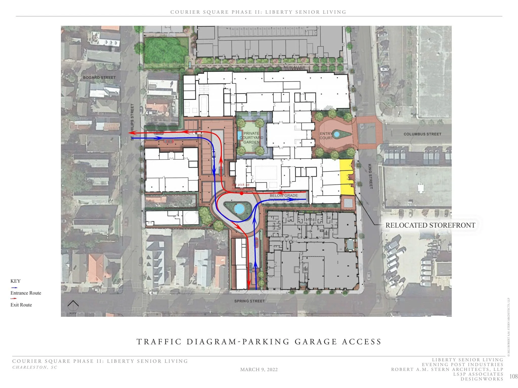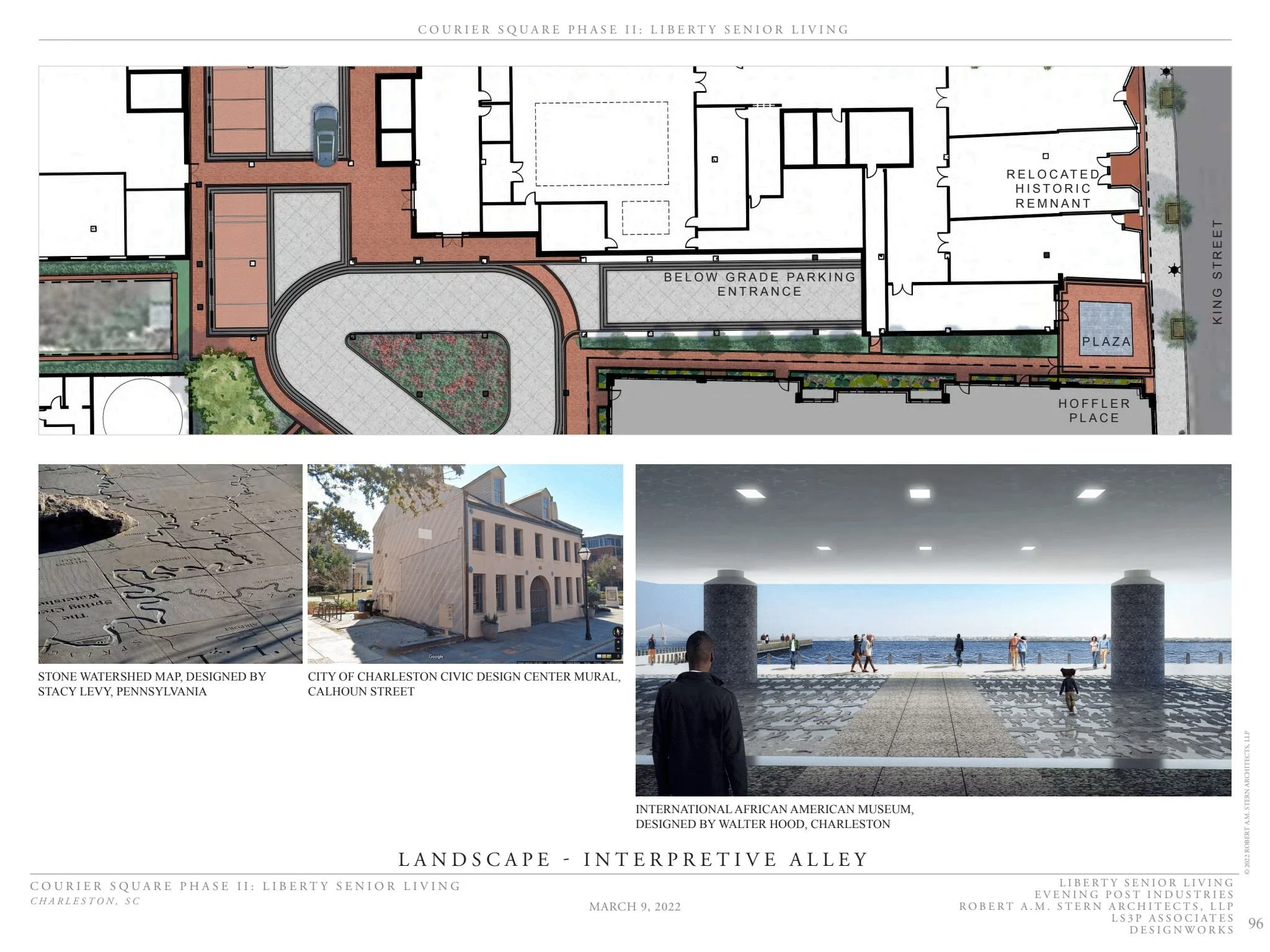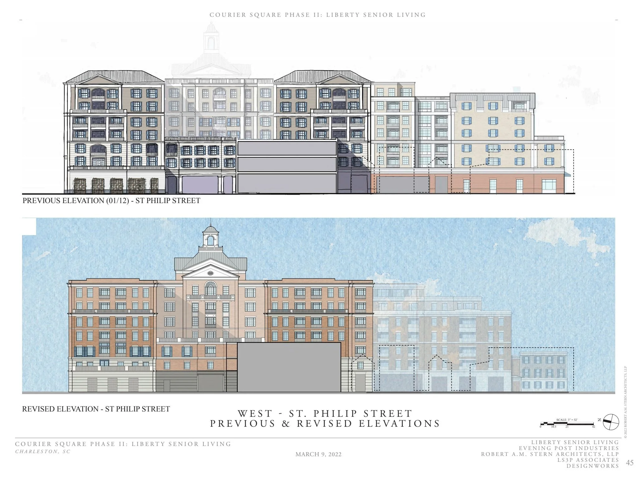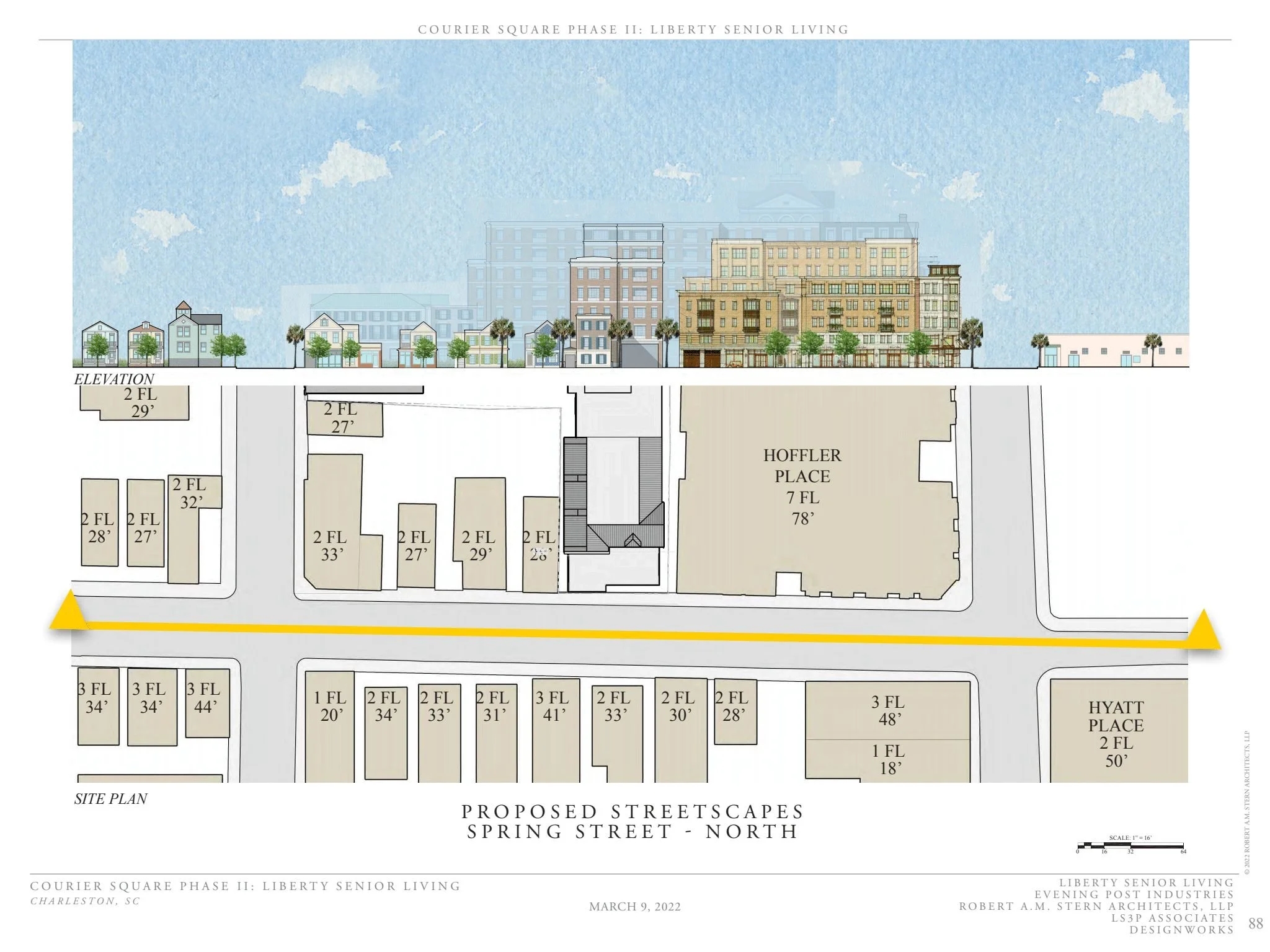 Located on Charleston’s King Street, this new building provides more than 140 senior-living condominium apartments in a building that respects the cherished architectural heritage of its historic city. The building terminates the axis of Columbus Street with a garden-like entry motor court at the street and a signature tower above. The contextually appropriate Georgian expression along King Street features clapboard on the shopfronts and brick on the residences above; top-floor apartments are tucked into a dormered mansard. On the west side, where the building faces a neighborhood of two- and three-story houses, the structure steps down in scale and facades are clad in clapboard. Porches and balconies enliven the composition, further reducing the visual mass and providing outdoor spaces, many with river views, to the apartments. A historic single-story Art Deco building has been relocated and incorporated into the scheme, and an integrated medical facility enjoys its own courtyard. The design was approved by Charleston’s Board of Architectural Review, which awarded the project an extra story for architectural merit.