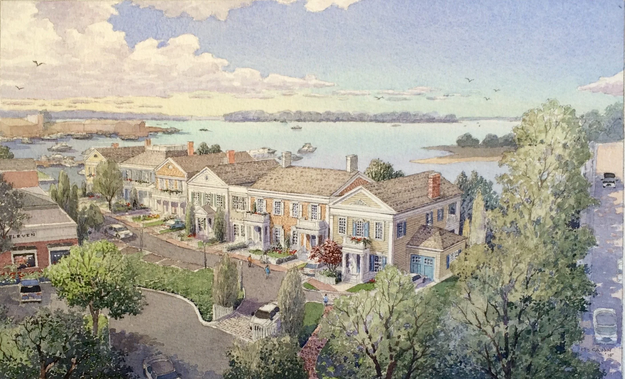 The design for six two-story townhouses, on a highly visible waterfront site near the landing of the bridge to North Haven and the Shelter Island ferry, is intended to welcome those arriving by car to the Greek Revival character of historic Sag Harbor. Each of the facades, some clad in clapboard and others shingled, features a Neoclassical entry porch; garages serve as hyphens connecting the residences. Facing the harbor and a proposed marina, porches on two levels overlook the new public John Steinbeck Park designed by landscape architect Edmund Hollander. An adjacent three-story apartment building completes the composition.